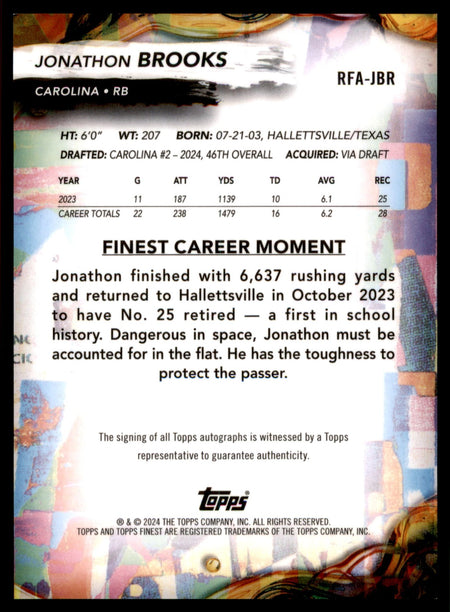 2024 Topps Finest Jonathon Brooks #RFA-JBR Rookie Finest Autographs