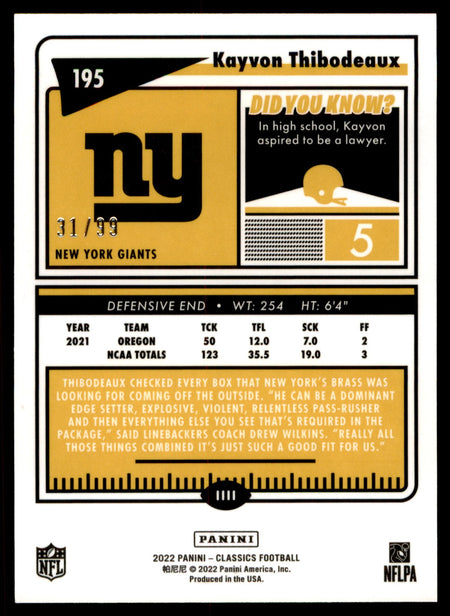 2022 Panini Classics Kayvon Thibodeaux #195 Timeless Tributes Gold /99