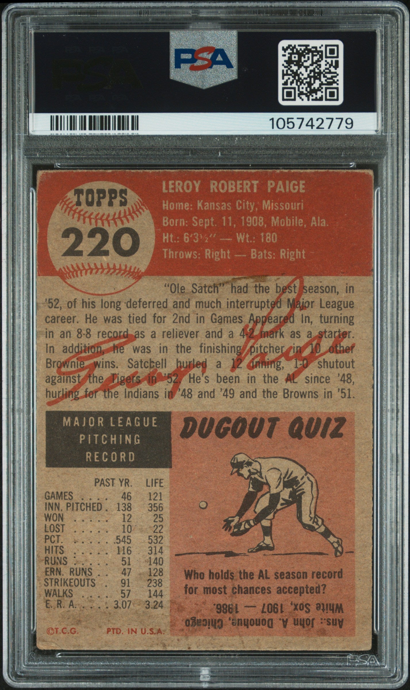 You are purchasing a 1953 Topps Satchell Paige #220 PSA 2. You will receive the exact item in the photographs. Thank you for looking. Listed With Mascot.