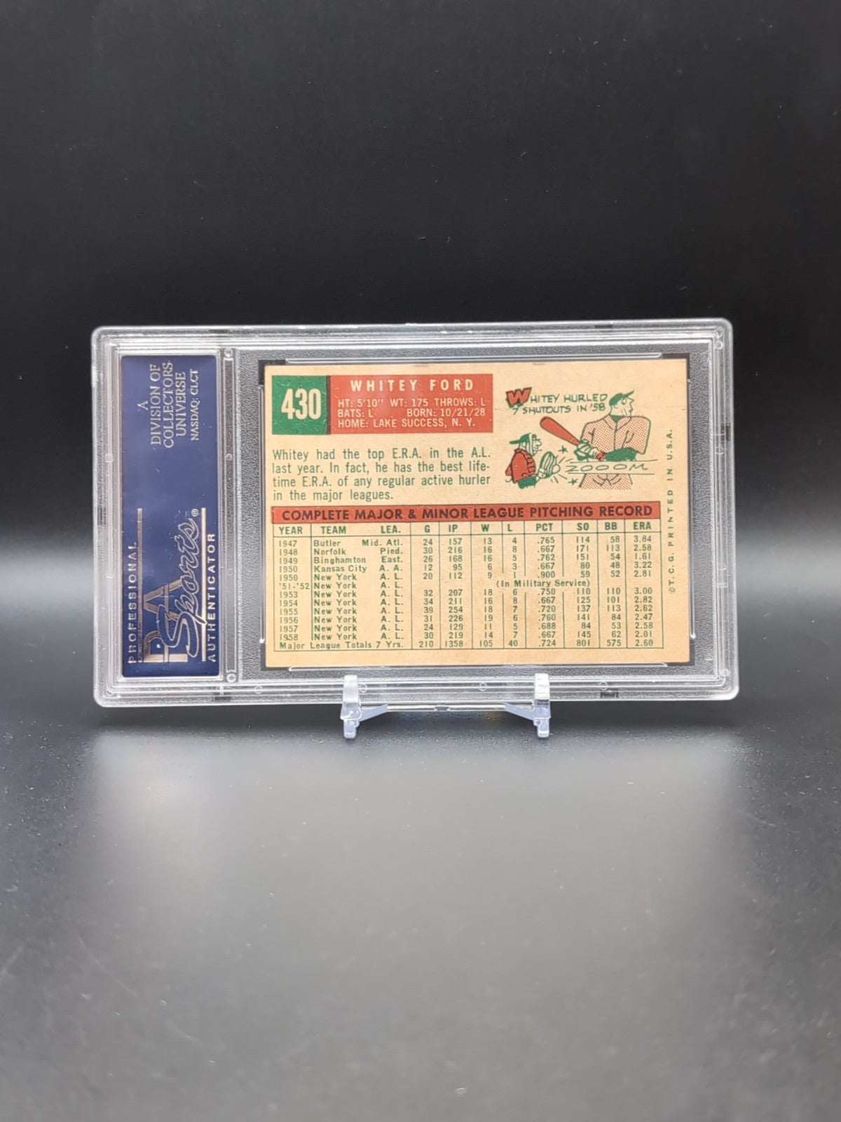 The product is a 1959 Topps Whitey Ford #430 sports trading card featuring the New York Yankees pitcher. This vintage collectible from the Topps manufacturer showcases the Hall of Famer in his prime, making it a valuable addition to any baseball card collection. With a PSA 5 grading, this card is sure to be a cherished item for fans of both Whitey Ford and the New York Yankees. Listed With Mascot.
