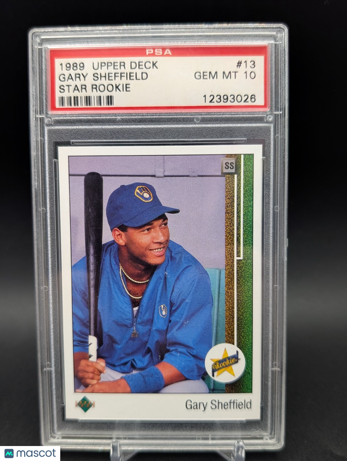 The product is a 1989 Upper Deck baseball trading card featuring Rookie player Gary Sheffield, card number #13. Graded PSA 10, he played for the Milwaukee Brewers during the 1989 season. This card is a valuable collectible for fans of baseball trading cards and collectors of rookie cards from the 1980s. The card showcases a young Gary Sheffield in his rookie year, making it a sought-after item for fans of the sport and the player. Listed With Mascot.