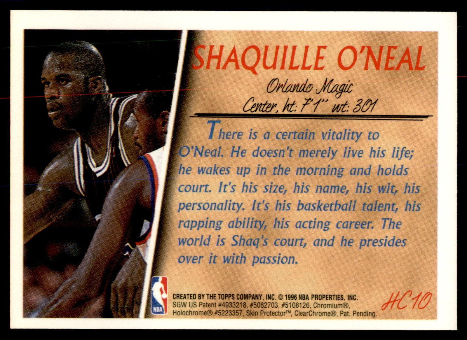 The product is a 1995-96 Topps basketball trading card featuring Shaquille O'Neal in his Orlando Magic uniform. This refractor card is a short print from the original set, making it a desirable collector's item for fans of the NBA. The card is a licensed reprint from the manufacturer Topps, showcasing O'Neal in his prime during the 1995-96 season. This card is a must-have for any basketball card enthusiast looking to add a rare and valuable piece to their collection. Any visible lines on the images are due to the hi-res scanner and are not on the actual card. Listed With Mascot.