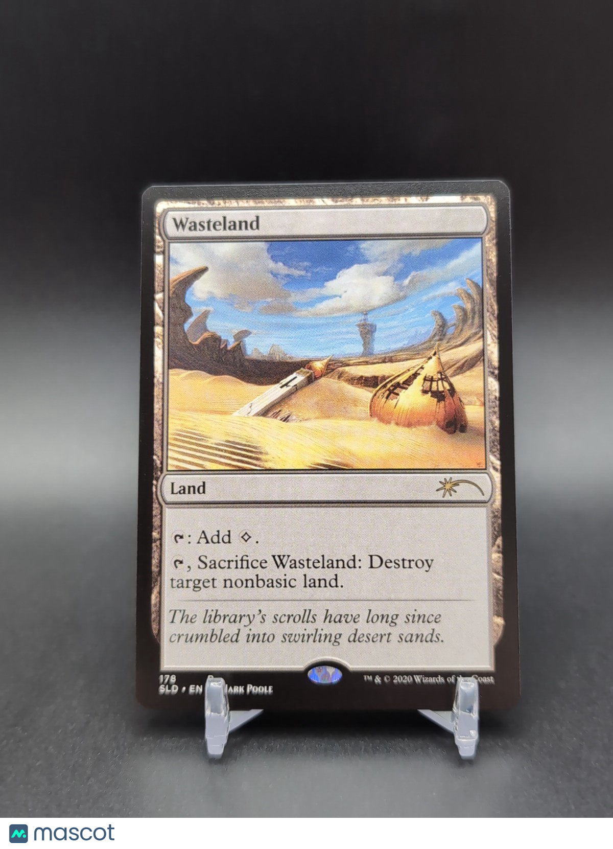 The product is a [1x] Wasteland card from the Secret Lair set of Magic: The Gathering, featuring artwork by Mark Poole. The card is a Land type with the ability to add 1 life and destroy a nonbasic land card when sacrificed. It is a unique (U) rarity card in English language, part of the Secret Lair Drop Series set. The card number is 178 with a regular finish. It is a highly sought-after collectible for Magic: The Gathering enthusiasts and card game collectors alike. Listed With Mascot.