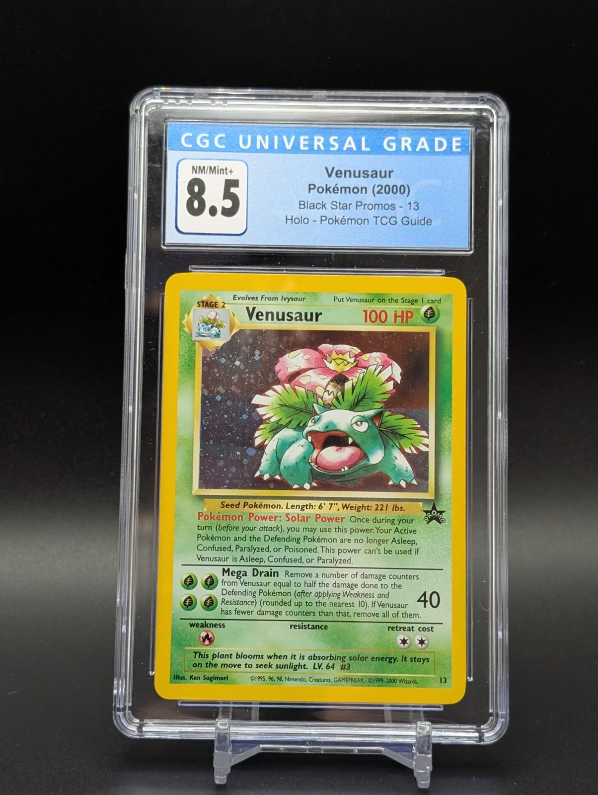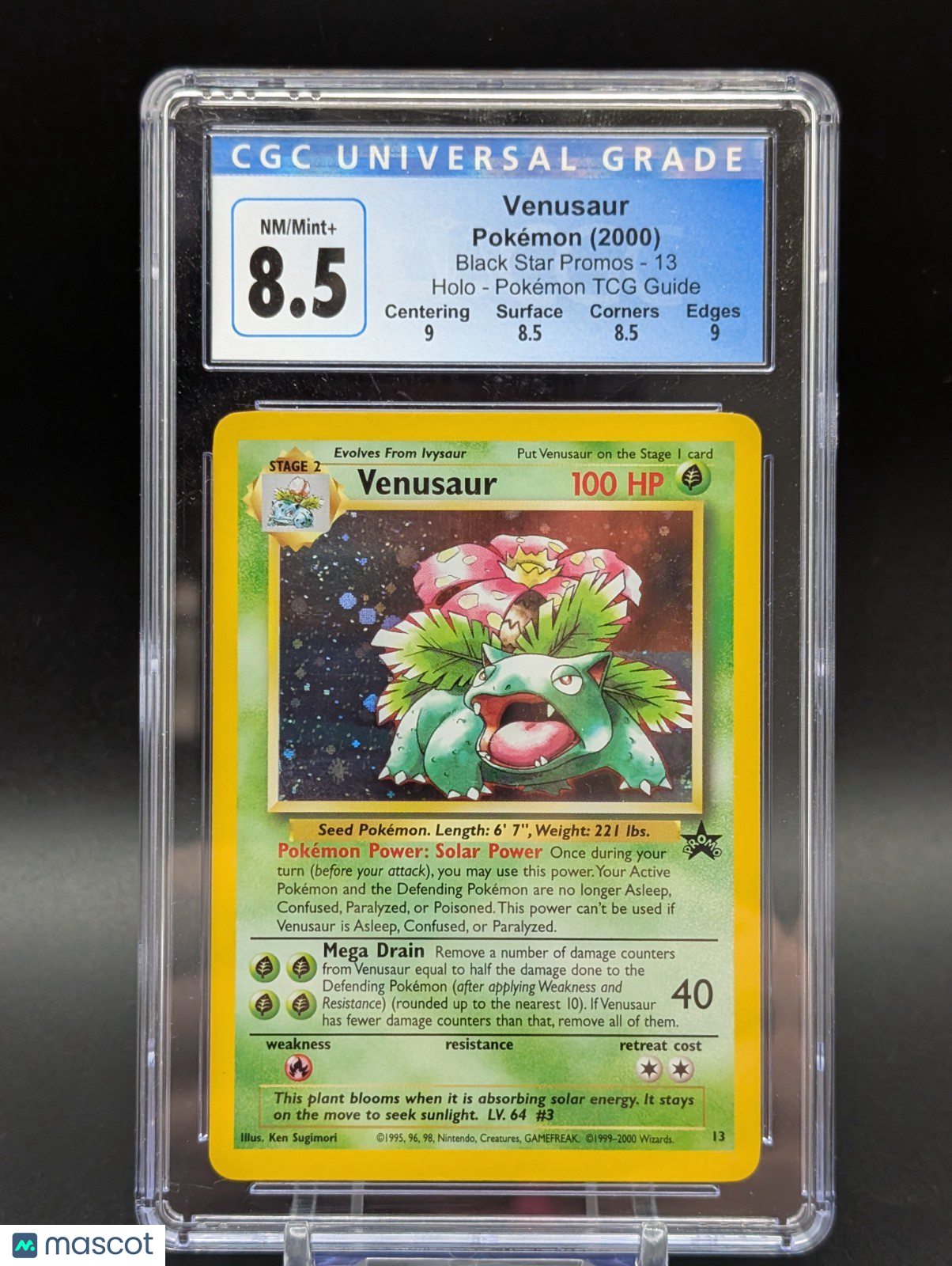 The product is a 2000 Black Star Promos Venusaur card graded CGC 8.5, which is a rare collectible card from the Pokémon TCG. This English-language card features the character Venusaur and is part of the Pokémon Black Star Promo set. With a population of 141 cards, this specific card is numbered 13 in the set and is a sought-after item for collectors due to its limited availability and association with a popular trading card game. Listed With Mascot.