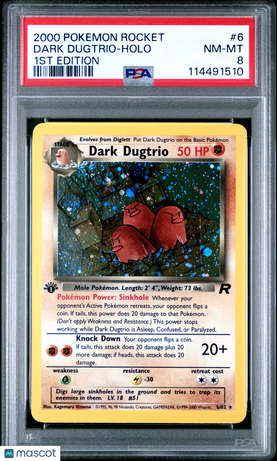 You are purchasing a 2000 Pokemon Rocket Dark Dugtrio #6 1ST Edition PSA 8. You will receive the exact item in the photographs. Thank you for looking. Listed With Mascot.