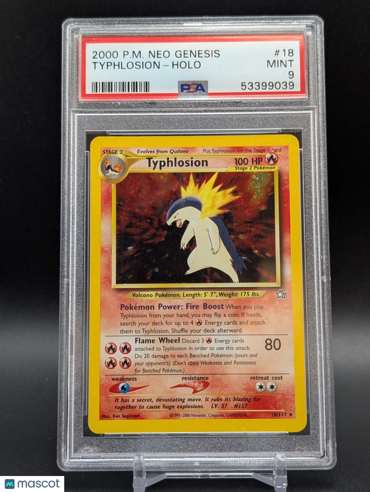 The product is a 2000 Pokémon Typhlosion 18/111 card from the Neo Genesis set, graded as a PSA 9. This Holo Rare card features Typhlosion with 100 HP and is part of the Unlimited Edition, illustrated by Ken Sugimori. Produced by The Pokémon Company, this Stage 2 Pokémon card in English language is a valuable addition to any Pokémon TCG collection. Listed With Mascot.