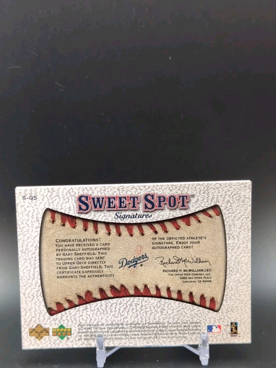 The product is a 2001 Upper Deck Sweet Spot Signatures Gary Sheffield #S-GS Auto trading card. This single-insert card features an autograph of the baseball player Gary Sheffield, who played for the Los Angeles Dodgers during the 2001 season. Manufactured by Upper Deck, this original card is a collector's item for fans of sports trading cards, specifically those interested in baseball memorabilia. Listed With Mascot.