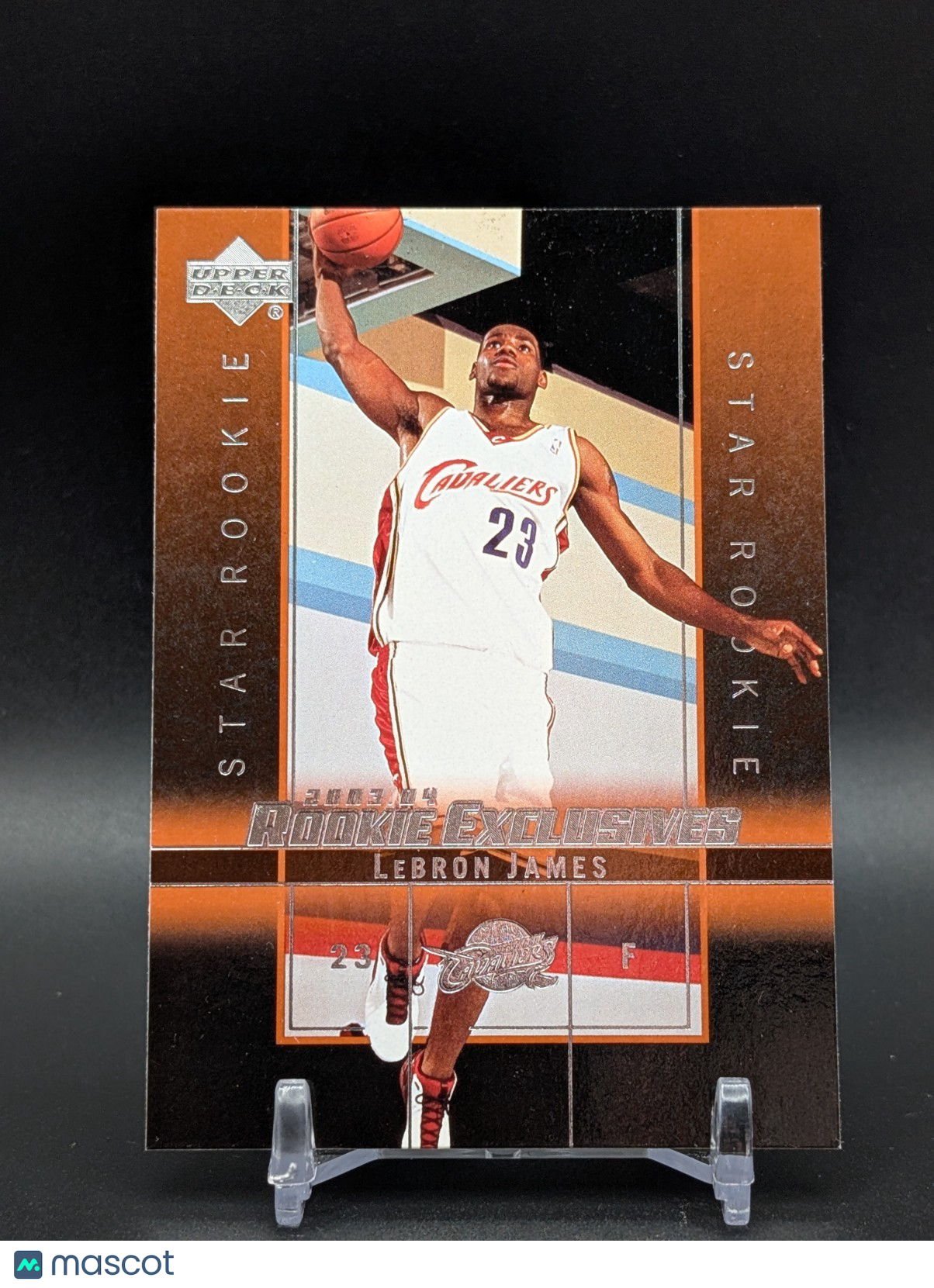 The product is a 2003-2004 Upper Deck Rookie Exclusive LeBron James trading card featuring the Cleveland Cavaliers. This card is part of the 2004 Upper Deck set and is considered a rookie card for LeBron James. It is a highly sought after collectible for basketball fans and enthusiasts of the sport, showcasing James during his early career with the Cleveland Cavaliers. This card holds historical importance as it marks LeBron James' debut in the NBA and is a valuable piece for sports memorabilia collectors. Listed With Mascot.