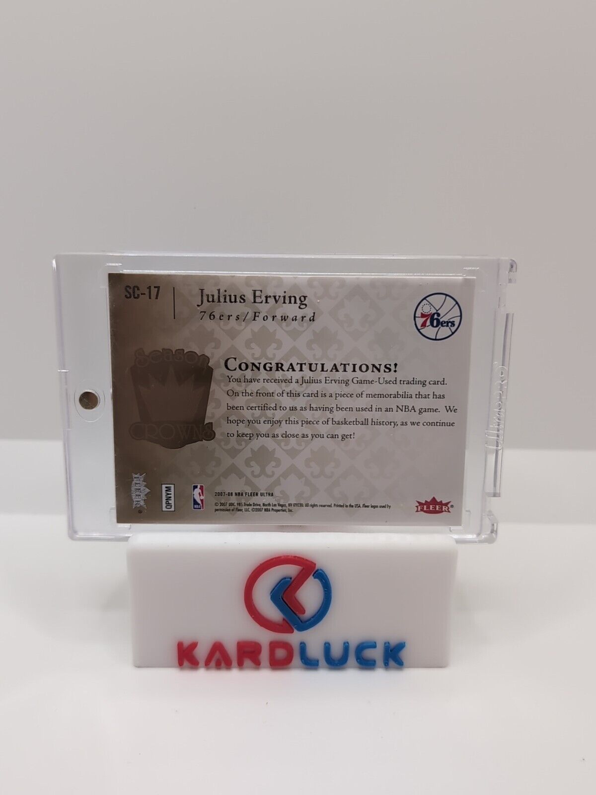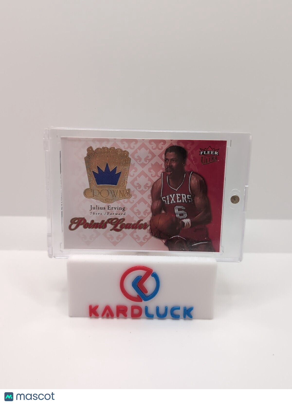 This 2007/08 Fleer Ultra Season Crowns Basketball Card #SC-17 features Julius Erving, a renowned player for the Philadelphia 76ers. The card is a sports trading card with a relic parallel/variety and memorabilia feature, making it a valuable addition to any collection. The card is from the NBA league and manufactured by Fleer. It is a part of the 2007-08 Fleer Ultra set. This trading card is perfect for basketball enthusiasts and collectors alike, with its unique features and historical significance. Listed With Mascot.