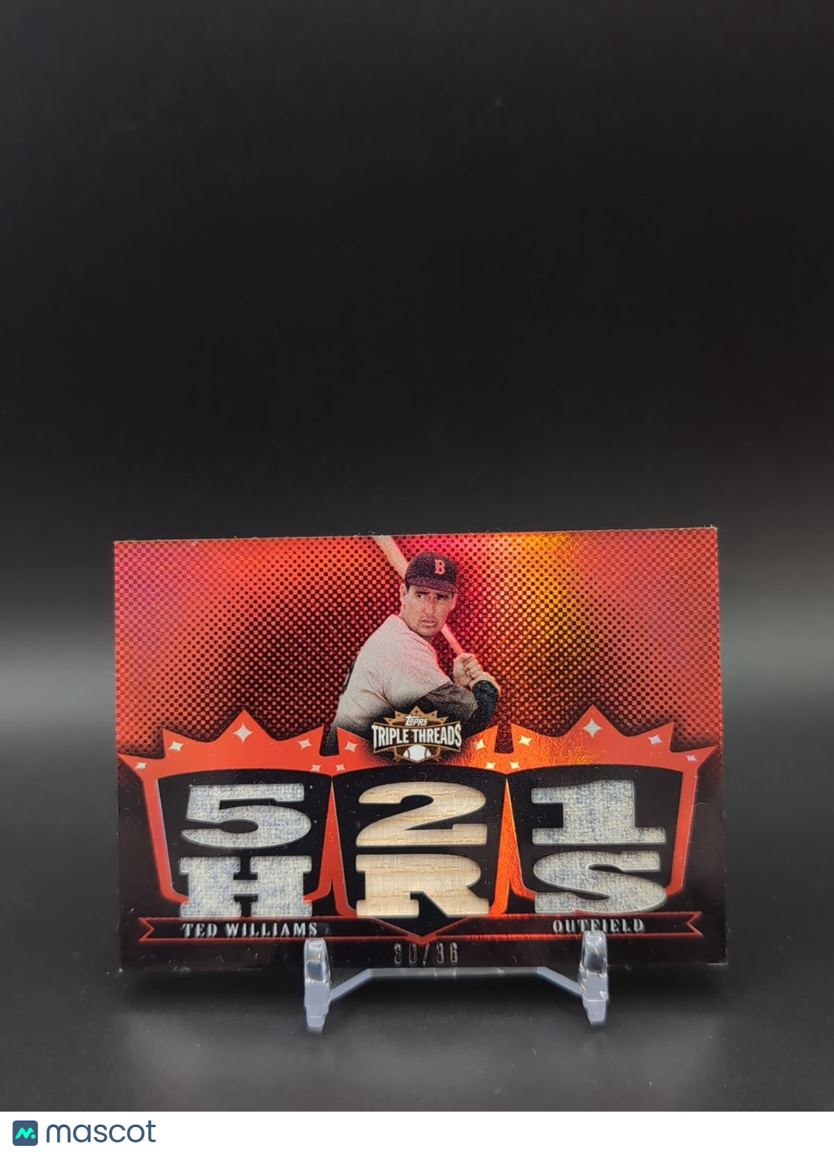 The product is a 2007 Topps Triple Threads baseball trading card featuring Ted Williams of the Boston Red Sox. This particular card includes 6 jersey patches and a bat patch, with a total of 36 cards in the set. The card showcases Ted Williams' career batting average of .344, as well as his impressive home run total of 521. It is a highly sought-after collectible for fans of Major League Baseball and collectors of sports trading cards, offering a piece of memorabilia from one of baseball's legendary players. Listed With Mascot.