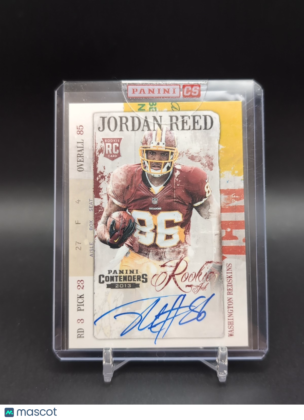 The product is a 2013 Panini Contenders Rookie Ink Auto trading card featuring Jordan Reed, a player for the Washington Redskins. This single-insert sports trading card is an original autograph of Jordan Reed from the 2013 season. Manufactured by Panini America, Inc., this card is a valuable collectible for fans of football and trading cards, especially those interested in rookie cards and autographed memorabilia. Listed With Mascot.