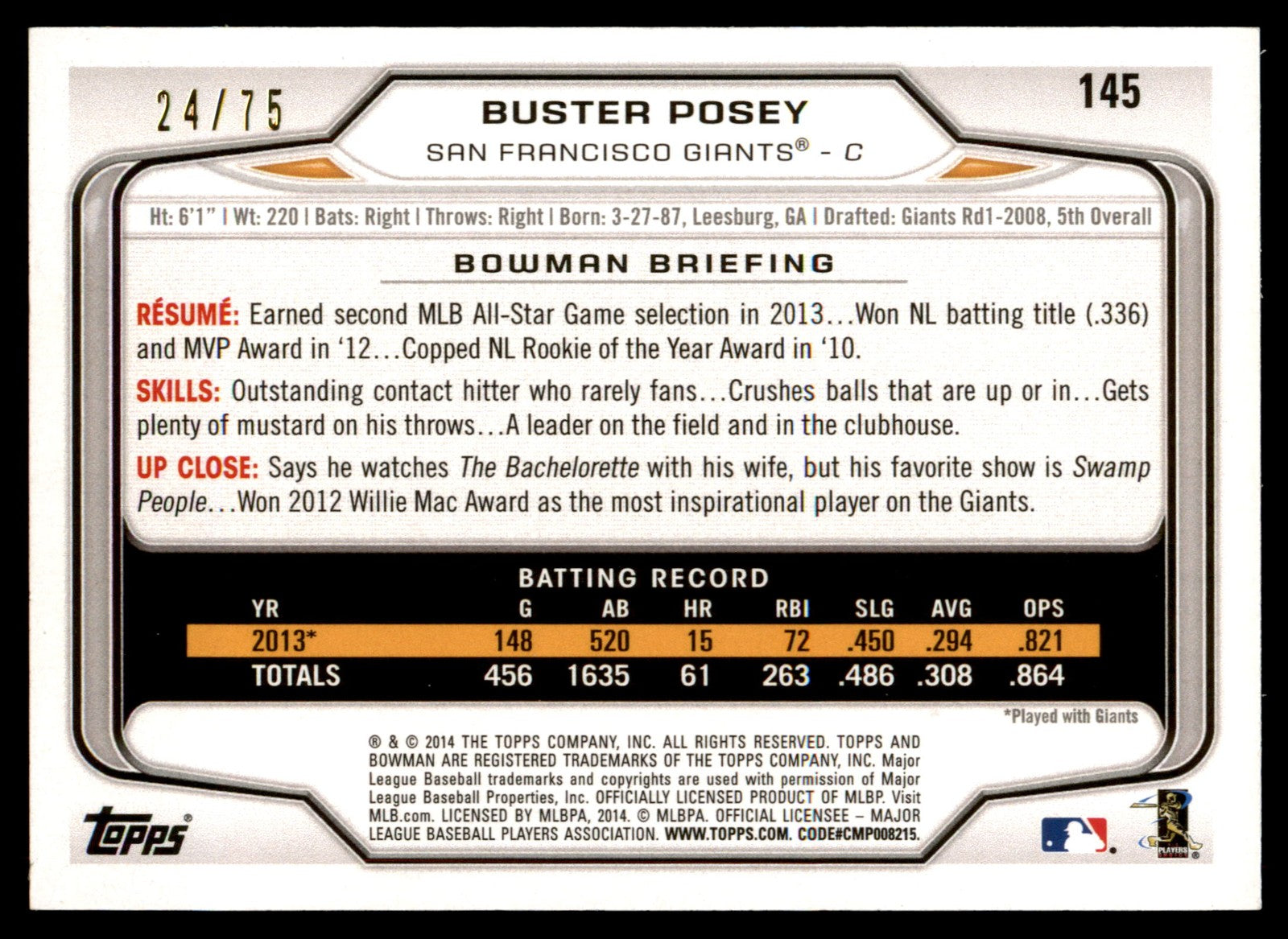Item Description 2014 Bowman Buster Posey #145 Silver /75 San Francisco Giants Any visible lines on the images are due to the hi-res scanner and are not on the actual card. Refer to hi-res images to evaluate card condition Shipping Please refer to the listing specifics for shipping price. Return Policy No Returns for Trading Cards Consignment Options Looking to sell your cards, but don't have time? Reach out to use here on eBay and we will be happy to assist you! Listed With Mascot.