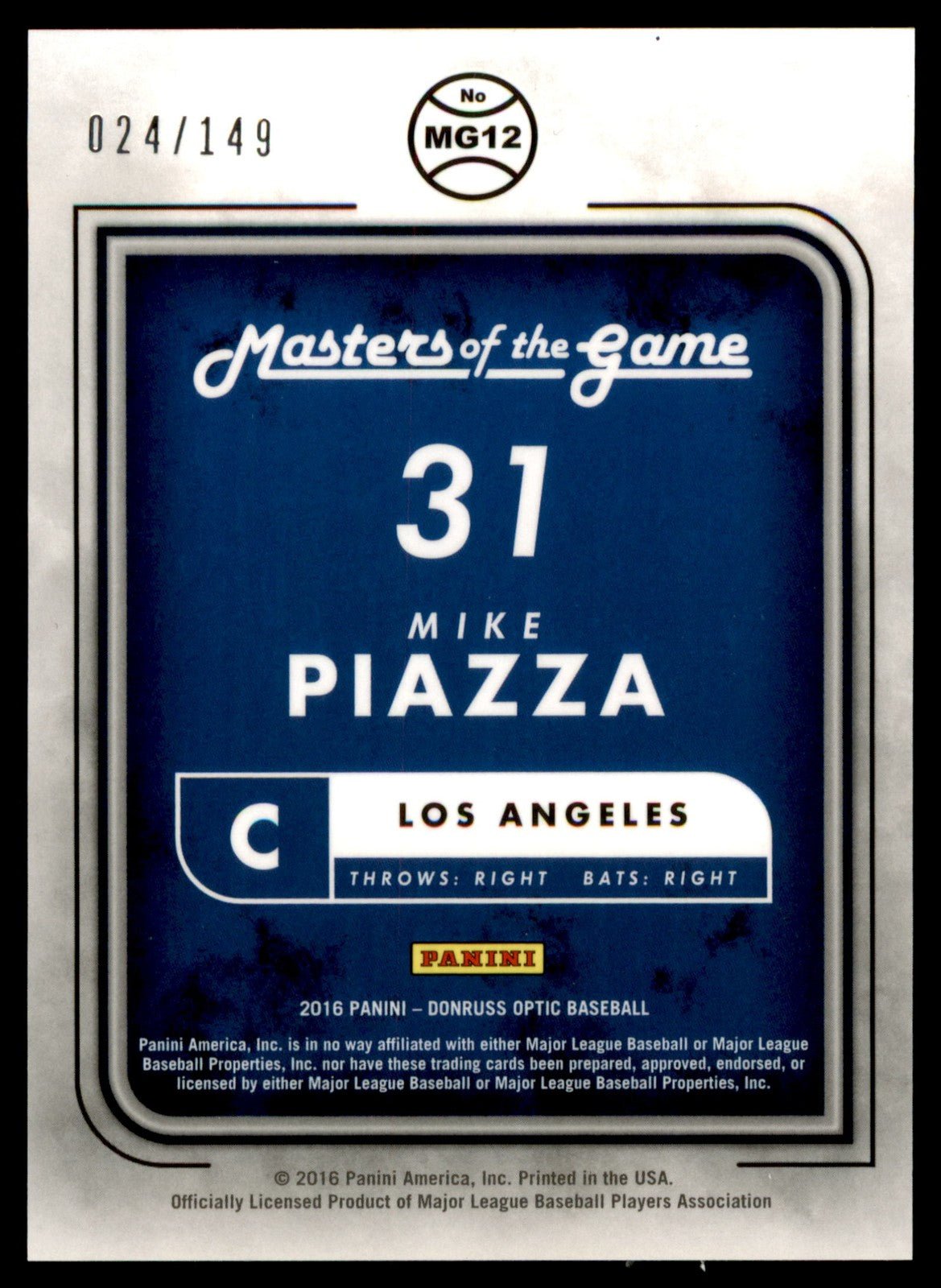 Item Description 2016 Donruss Optic Mike Piazza #MG-12 Masters of the Game Masters of the Game Blue /149 Los Angeles Dodgers Any visible lines on the images are due to the hi-res scanner and are not on the actual card. Refer to hi-res images to evaluate card condition Shipping Please refer to the listing specifics for shipping price. Return Policy No Returns for Trading Cards Consignment Options Looking to sell your cards, but don't have time? Reach out to use here on eBay and we will be happy to assist you! Listed With Mascot.