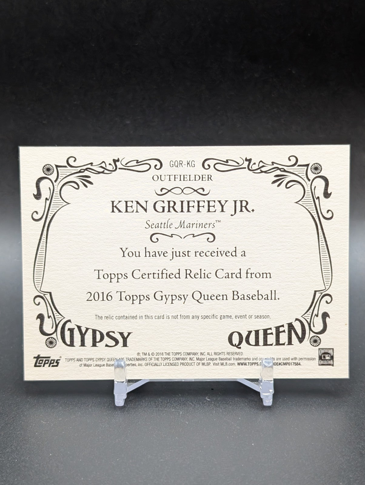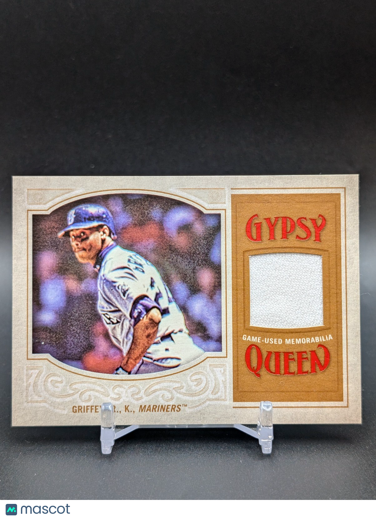 The product is a 2016 Topps Gypsy Queen Relics Ken Griffey Jr trading card featuring a piece of authentic game-used memorabilia from the Seattle Mariners Hall of Famer. This single sports trading card is an original insert in the Major League Baseball set, manufactured by Topps in the United States. The card is a part of the Relics subset, with the card number GQR-KG, making it a valuable collectible for baseball fans and sports card enthusiasts looking to add a unique piece of memorabilia to their collection. Listed With Mascot.