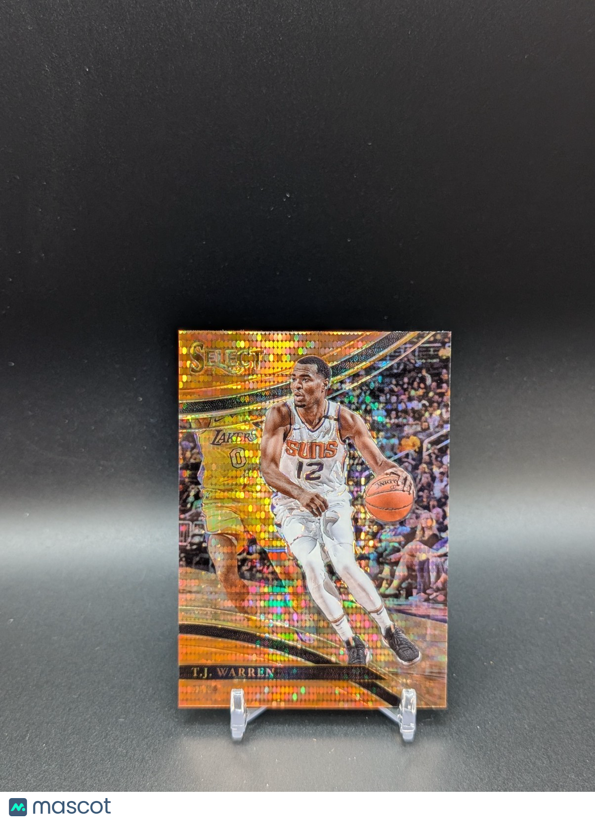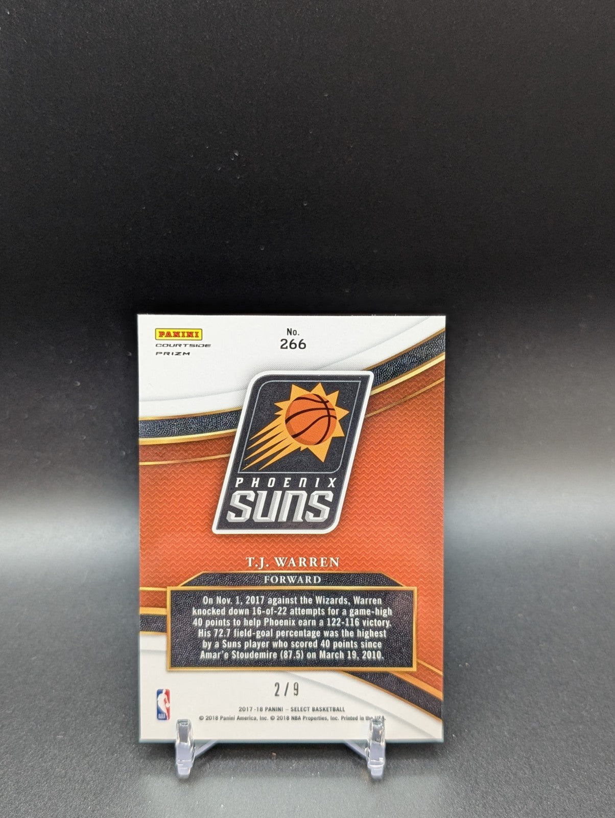Elevate your basketball card collection with the 2017-18 Panini Select FOTL Neon Orange Pulsar TJ Warren card, numbered #266. This limited edition piece, with only 9 in existence, captures the essence of T.J. Warren's high-energy play during his time with the Phoenix Suns. The card, from the esteemed Panini America, Inc., features the brilliant Neon Orange Pulsar parallel, adding a vibrant flare to its design. A must-have for any serious collector, this card from the 2017-18 season is a testament to Warren's growing legacy in the sport. Its rarity and the prestigious First Off The Line (FOTL) designation make it a standout addition. Whether you're a die-hard Suns fan or a connoisseur of finely crafted sports memorabilia, this card is sure to be a centerpiece of your collection. Listed With Mascot.