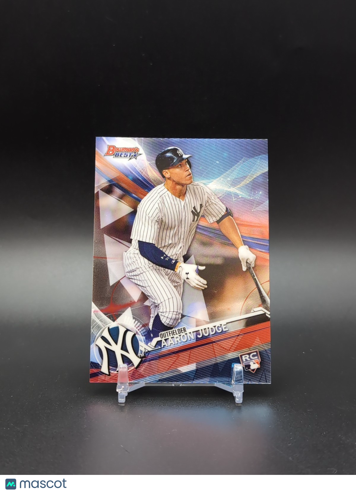 The product is a 2017 Bowman's Best Aaron Judge Rookie Card #1 featuring the player from the New York Yankees. This trading card is a valuable collectible for baseball fans, showcasing Judge's rookie season in the MLB. Produced by Bowman, known for their high-quality sports trading cards, this item is a sought-after piece for collectors and fans of the sport. With its specific player, team, and set designation, this card is a must-have for any baseball card enthusiast. Listed With Mascot.