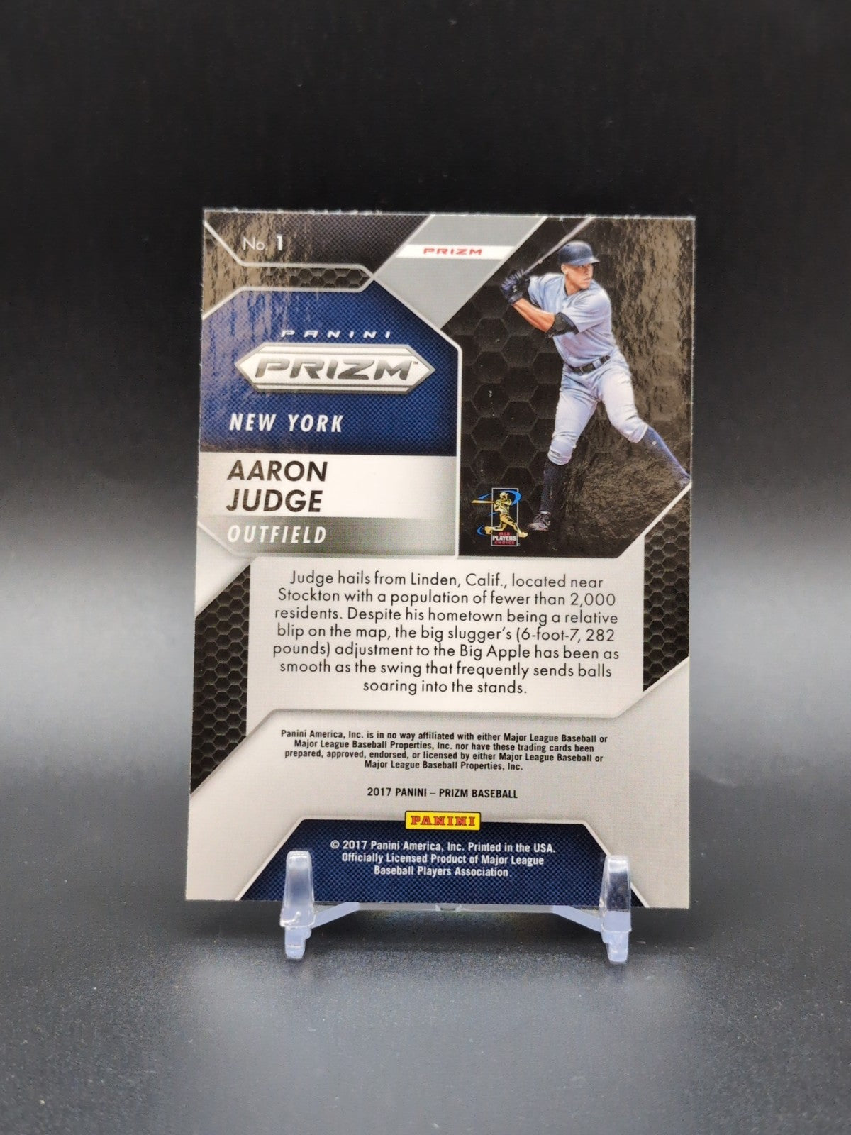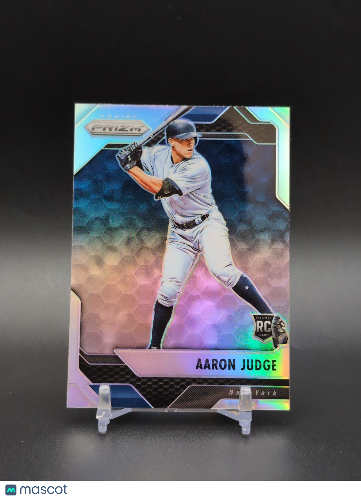 The product is a 2017 Panini Chronicles #1 Aaron Judge Rookie Card featuring a Silver Prizm design, showcasing the New York Yankees player. This sports trading card is an original print made of card stock with a thickness of 20 Pt. It is part of the MLB league, specifically designed for Major League Baseball fans and collectors. The card commemorates Judge's rookie season in 2017 and is a valuable addition to any baseball card collection. Listed With Mascot.