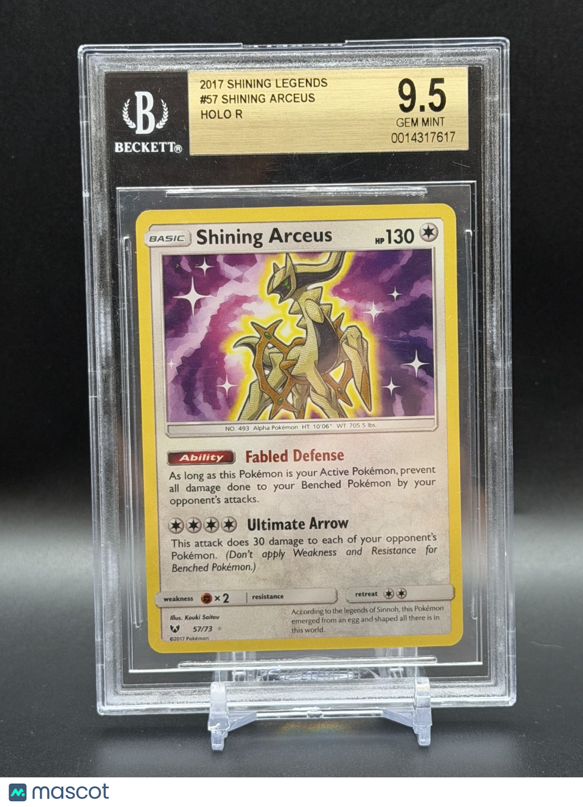 The product is a 2017 Shining Legends #57 Shining Arceus Holo card from the Pokémon Trading Card Game. This LEGEND card has an HP of 130 and is part of the Shining Legends set. With a Holo finish, this collectible card is suitable for players aged 6 and above, making it a valuable addition to any Pokémon TCG collection. Listed With Mascot.