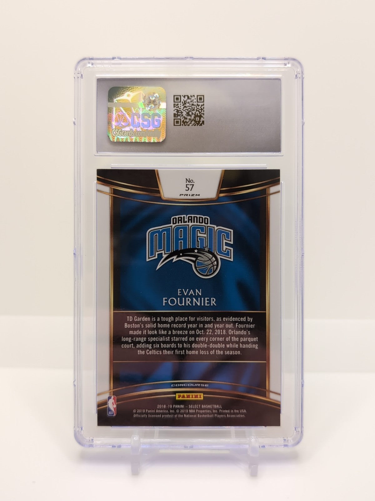 The product is a 2018-19 Panini Select Evan Fournier #57 Zebra basketball trading card. This single-parallel card features Evan Fournier from the Orlando Magic, with a unique Zebra design. Manufactured by Panini America, Inc., this original card is part of the 2018 Panini set and is graded as a CSG 9.5. A valuable addition for collectors and fans of basketball trading cards. Listed With Mascot.