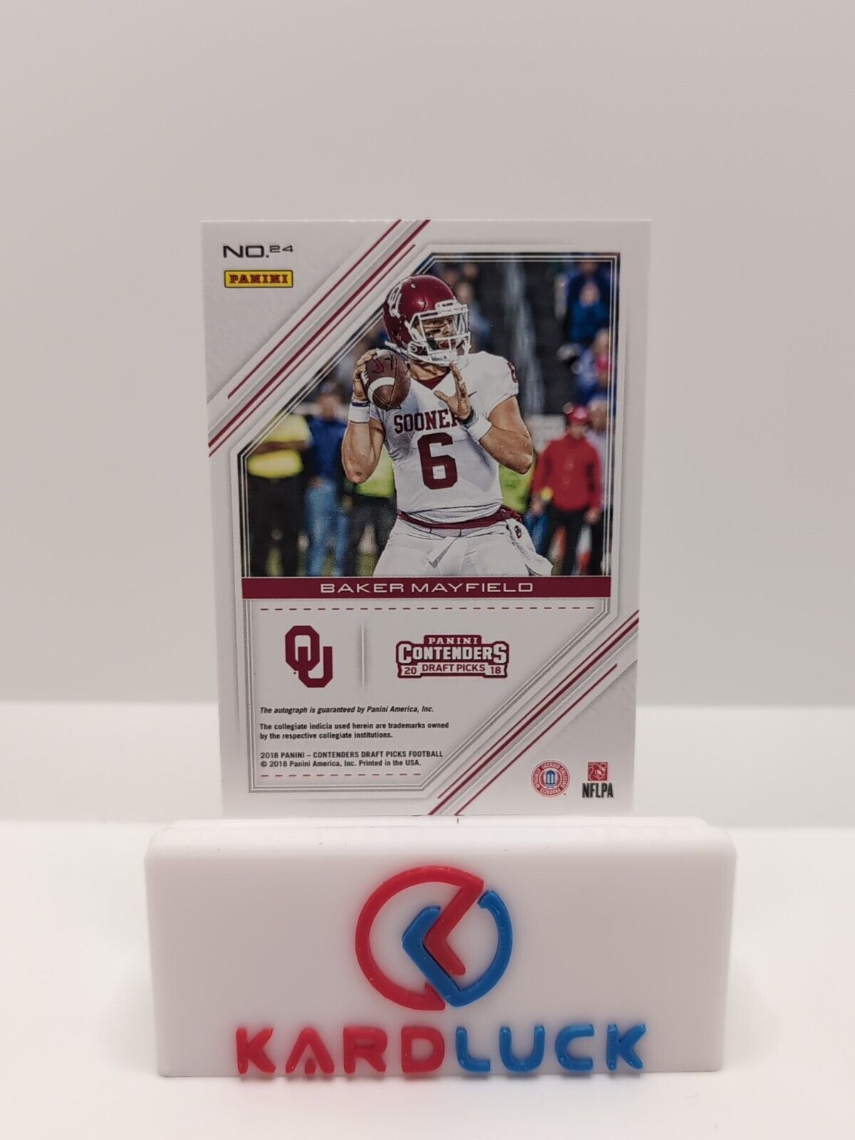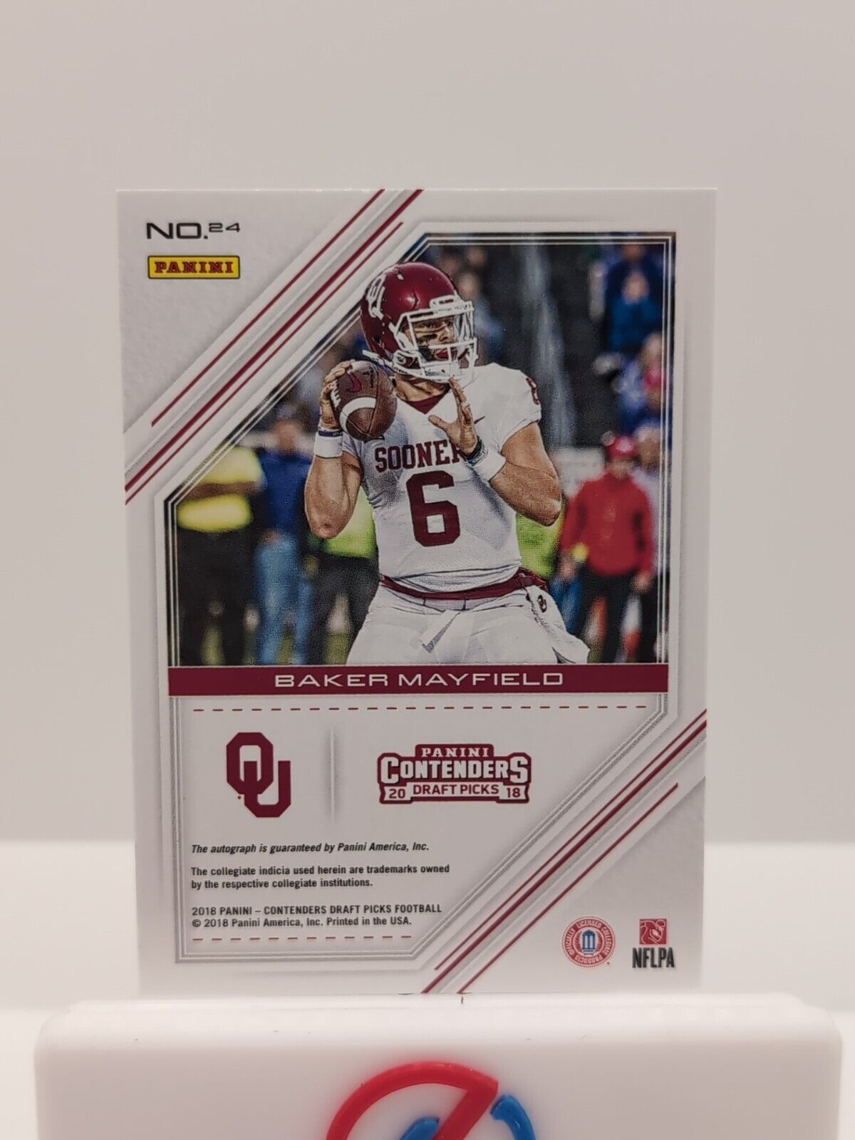 This 2018 Panini Contenders Draft Picks Game Day Ticket Auto /25 is a must-have for any football fan. Featuring the rookie quarterback, Baker Mayfield, this trading card is a part of the National Collegiate Athletic Association (NCAA) league and is perfect for collectors looking for a unique addition to their collection. The card is manufactured by Panini and is a parallel/variety, with a card number of 24. It is a part of the Game Day Tickets insert set and is limited to only 25 copies. This card is perfect for fans and collectors alike who are looking for a rare and valuable addition to their collection. Listed With Mascot.