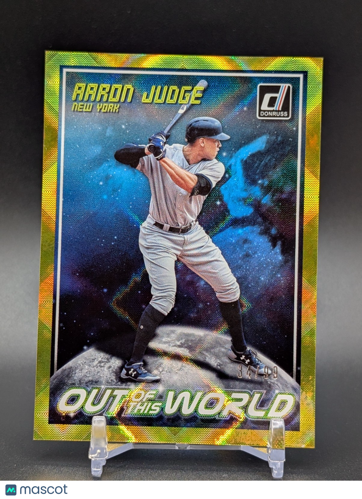 The product is a 2018 Panini Donruss Aaron Judge Out Of This World Yellow /99 trading card featuring the New York Yankees baseball player. This original foil card is part of the 2018 Panini Donruss set and is numbered #999. As a highly collectible item, this card showcases Aaron Judge in a unique and limited edition design, making it a sought-after piece for fans and collectors alike. Listed With Mascot.