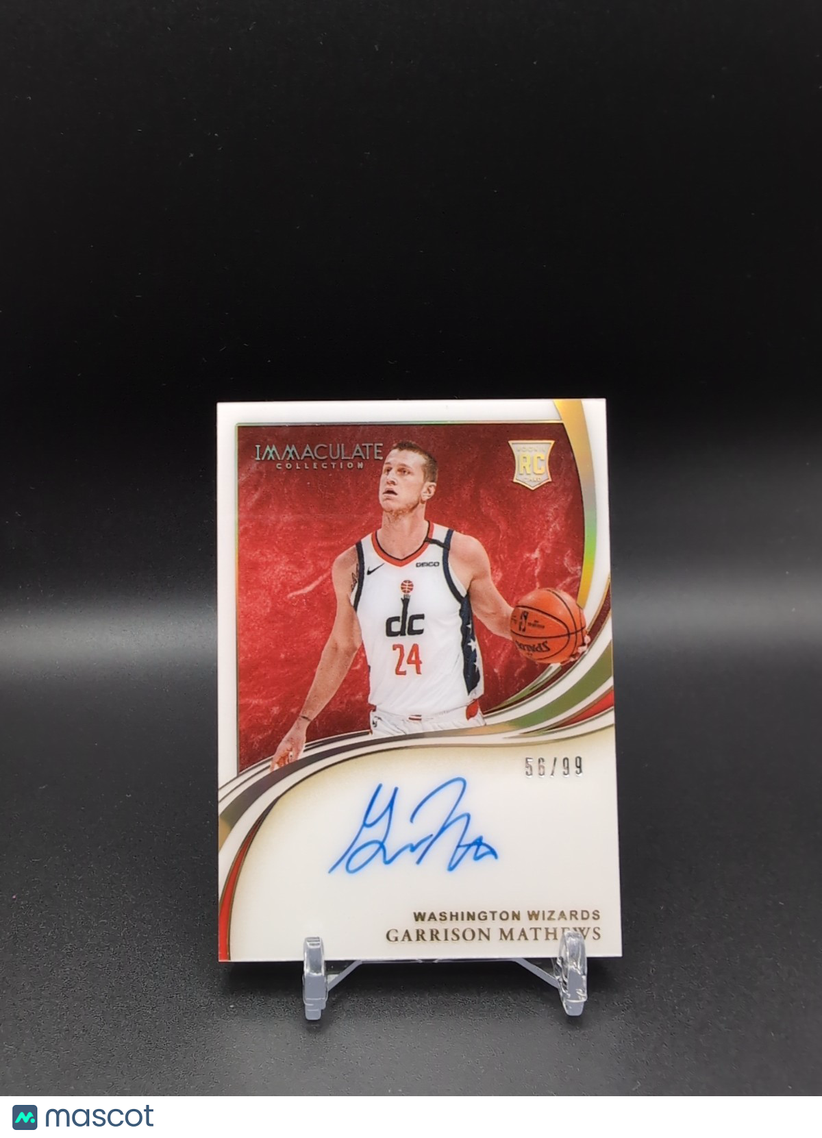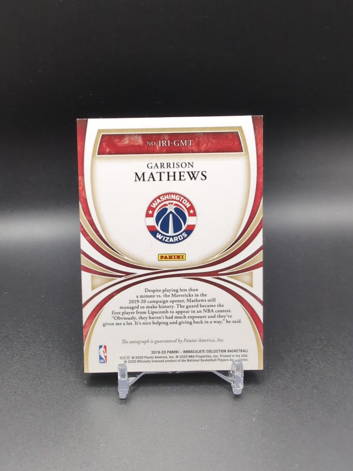 Elevate your collection with the 2019-20 Immaculate Collection Imm Rookie Intro Autographs #7 featuring the talented Garrison Mathews. This sought-after card highlights Mathews' breakthrough season with the Washington Wizards, capturing the essence of his on-court prowess and potential. With its serial numbering, this piece is a unique treasure for enthusiasts and fans alike. Crafted by the renowned Panini Group, this card is a part of the prestigious Immaculate Collection brand, known for its high-quality production and attention to detail. As an original, rookie card with an autograph, it represents a valuable snapshot of a player's early career, making it a standout addition to any basketball card collection. Listed With Mascot.