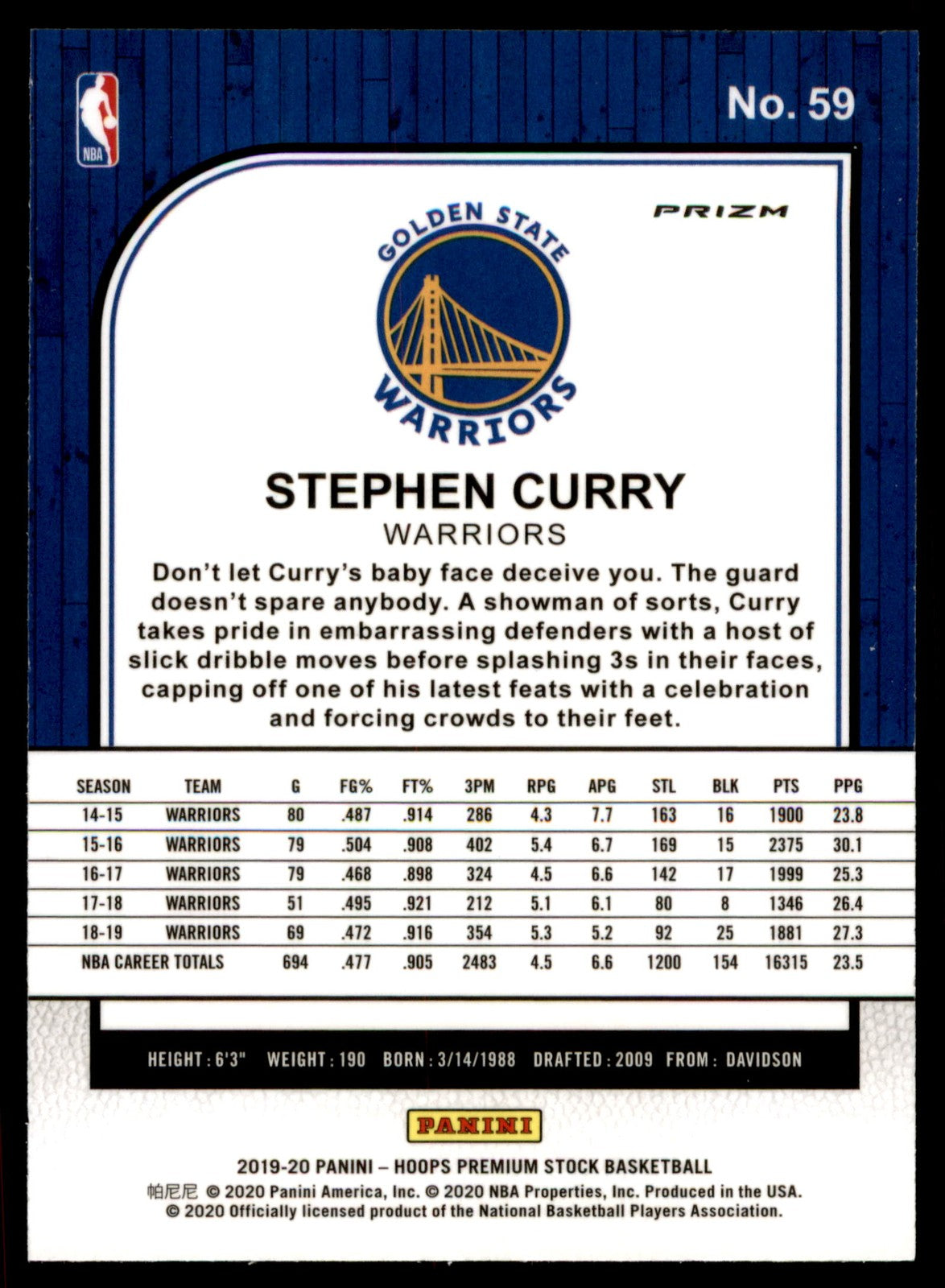 Item Description 2019 Hoops Premium Stock Stephen Curry #59 Golden State Warriors Any visible lines on the images are due to the hi-res scanner and are not on the actual card. Refer to hi-res images to evaluate card condition Shipping Please refer to the listing specifics for shipping price. Return Policy No Returns for Trading Cards Consignment Options Looking to sell your cards, but don't have time? Reach out to use here on eBay and we will be happy to assist you! Listed With Mascot.