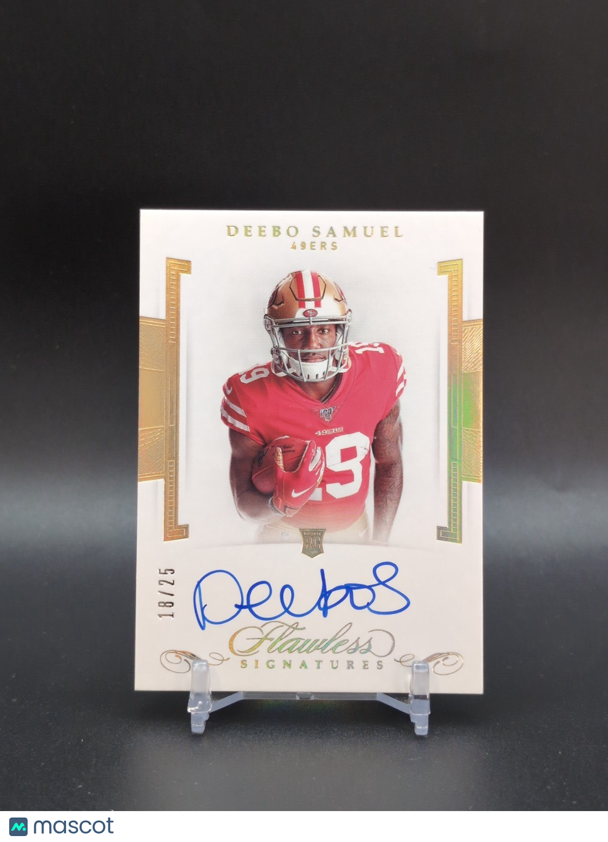 The product is a 2019 Panini National Treasures Deebo Samuel on-card rookie autographed trading card, featuring a hard-signed autograph by the player himself. This limited edition card is part of the NFL Gear set and has a print run of only 99, making it a highly sought-after collectible for fans of the San Francisco 49ers and football enthusiasts alike. With its unique features such as being serial numbered, a rookie card, and having a patch parallel variety, this original card manufactured by Panini is a valuable addition to any sports trading card collection. Listed With Mascot.