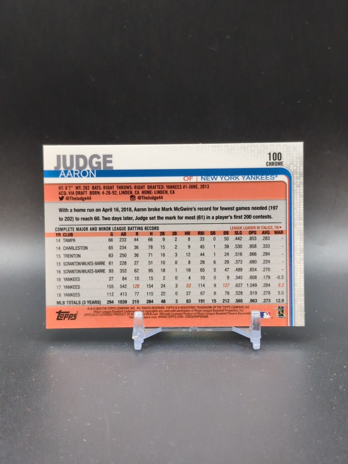 2019 Topps Chrome Aaron Judge Negative Refractor #100 New York Yankees MVP