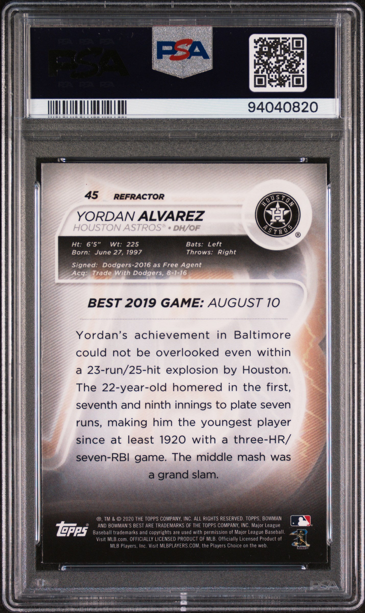 You are purchasing a 2020 Bowman's Best Yordan Alvarez #45 Refractor PSA 9. You will receive the exact item in the photographs. Thank you for looking. Listed With Mascot.