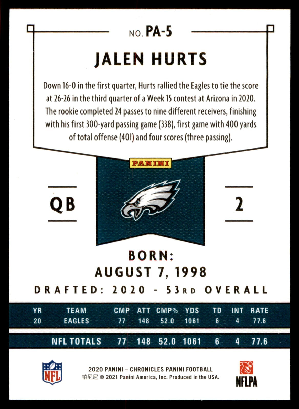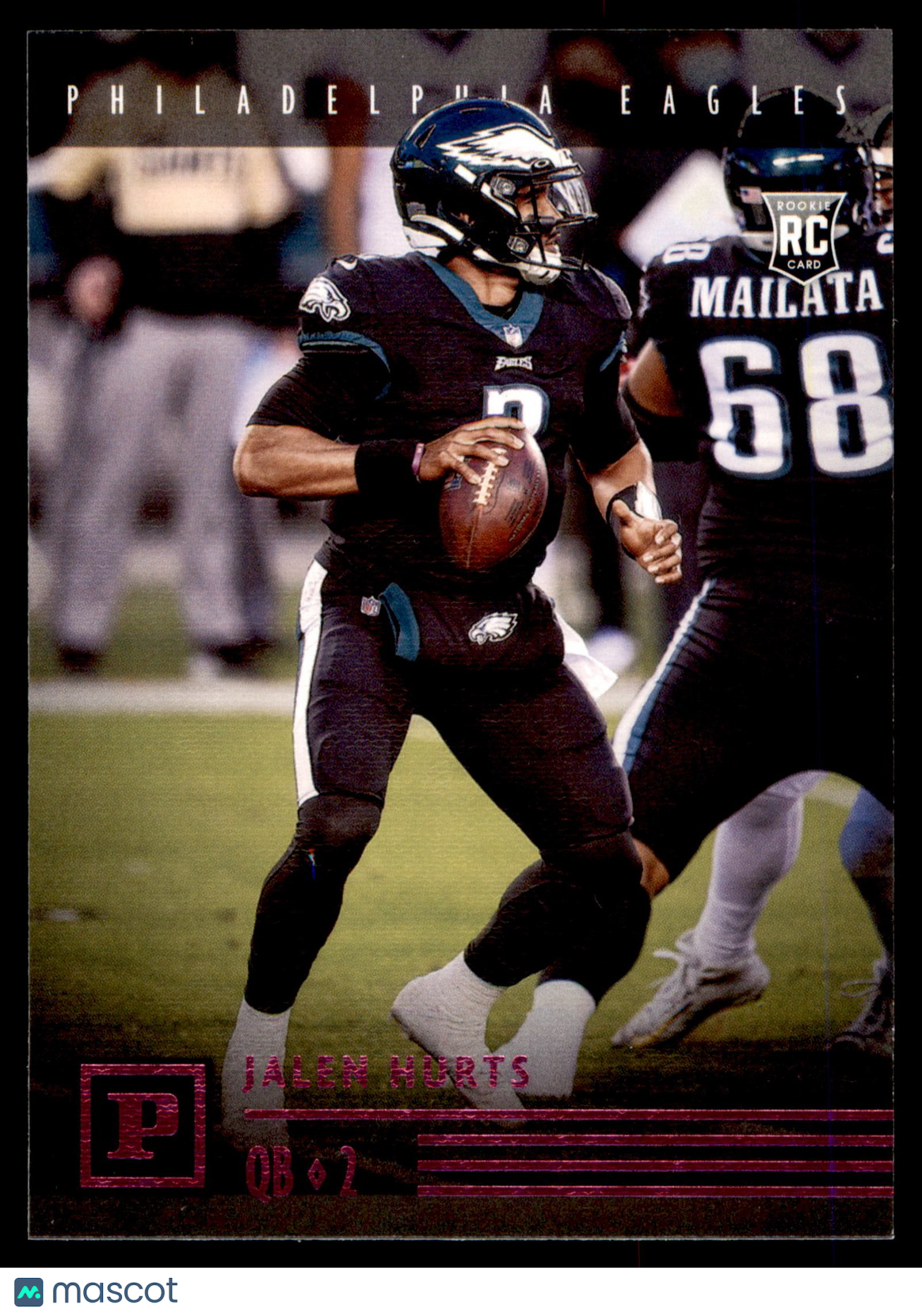 Item Description 2020 Panini Chronicles Jalen Hurts #PA-5 Panini Panini Pink Philadelphia Eagles Any visible lines on the images are due to the hi-res scanner and are not on the actual card. Refer to hi-res images to evaluate card condition Shipping Please refer to the listing specifics for shipping price. Return Policy No Returns for Trading Cards Consignment Options Looking to sell your cards, but don't have time? Reach out to use here on eBay and we will be happy to assist you! Listed With Mascot.