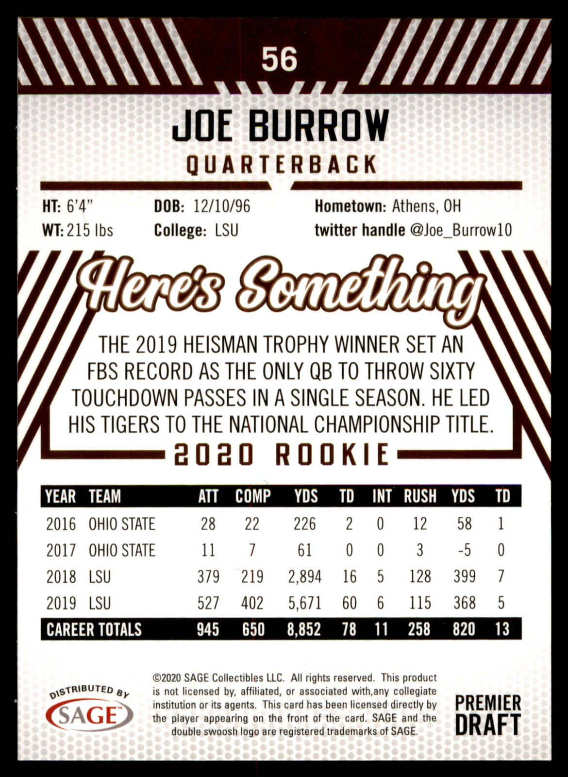 Item Description 2020 SAGE HIT Joe Burrow #56 Red LSU Tigers Any visible lines on the images are due to the hi-res scanner and are not on the actual card. Refer to hi-res images to evaluate card condition Shipping Please refer to the listing specifics for shipping price. Return Policy No Returns for Trading Cards Consignment Options Looking to sell your cards, but don't have time? Reach out to use here on eBay and we will be happy to assist you! Listed With Mascot.