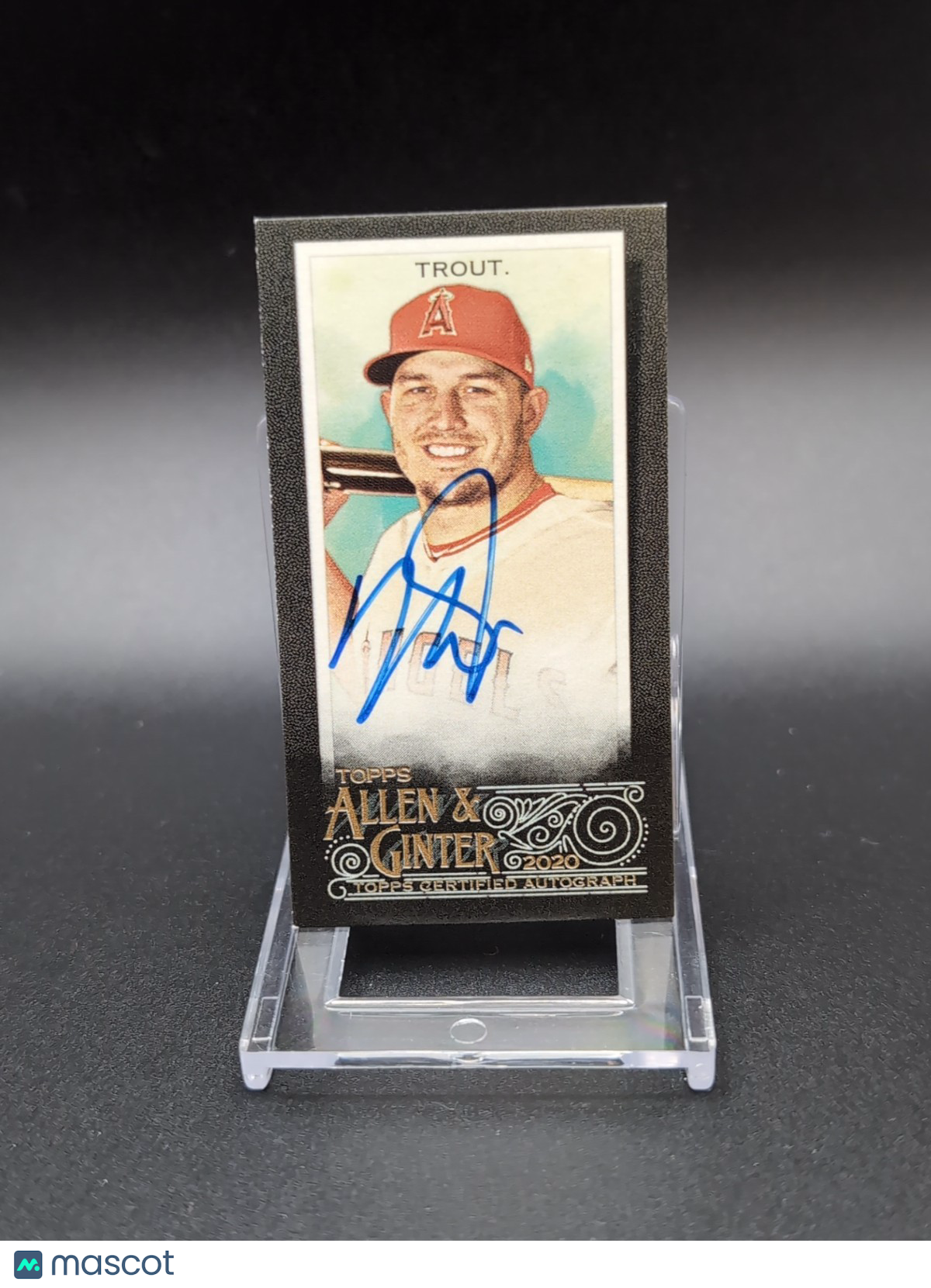 The product is a 2020 Topps Allen & Ginter X Mike Trout Black Mini Auto trading card, featuring an autograph from Mike Trout of the Los Angeles Angels. This card is part of the Major League Baseball (MLB) league and is a standard size sports trading card. The autograph is hard-signed and authenticated by Topps, making it a valuable collector's item for fans of Mike Trout and the Los Angeles Angels. The card is a limited edition short print with a parallel variety, making it a sought-after item within the sports trading card market. Listed With Mascot.