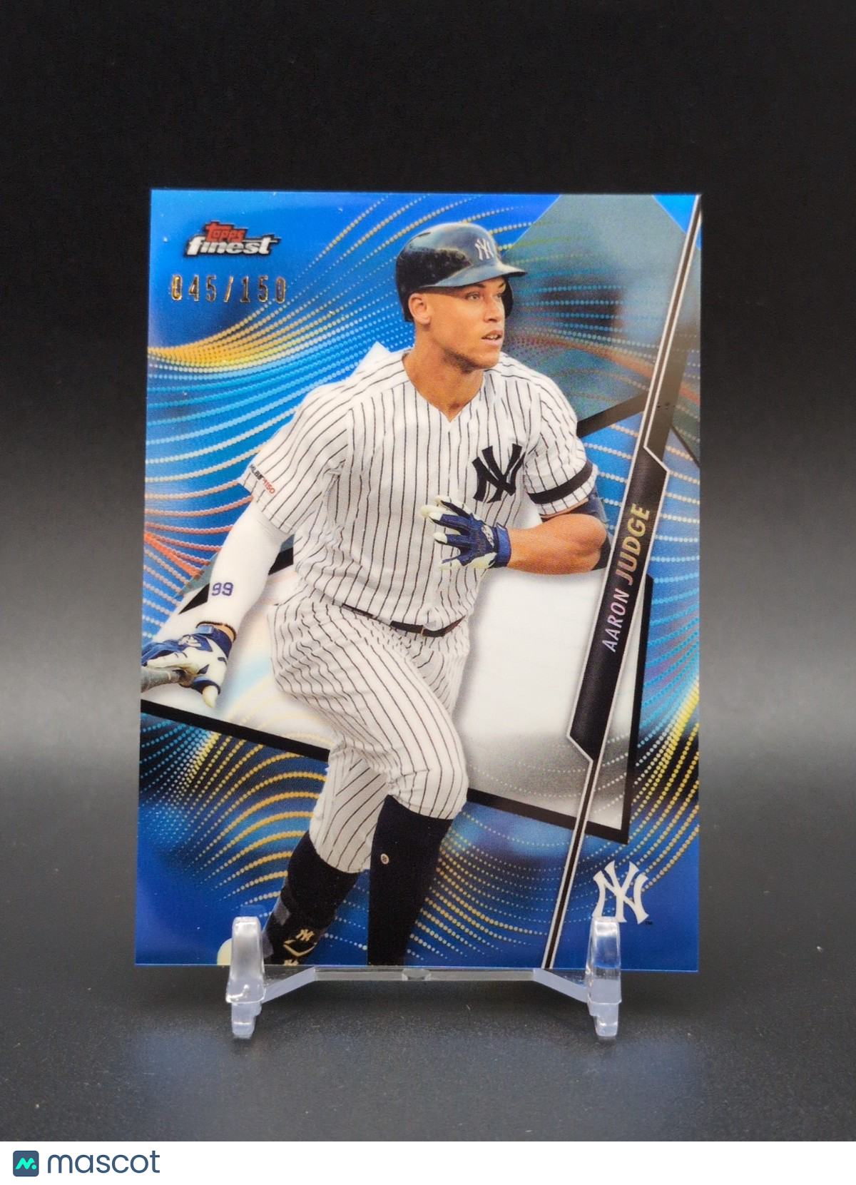 The product is a 2020 Topps Finest Aaron Judge Blue Refractor trading card, numbered /150. It features the New York Yankees player in a limited edition parallel variety from the sports trading card set. Produced by Topps, this card is a collectible item for baseball fans and card enthusiasts, showcasing Judge in his Yankees uniform for the 2020 season. Listed With Mascot.