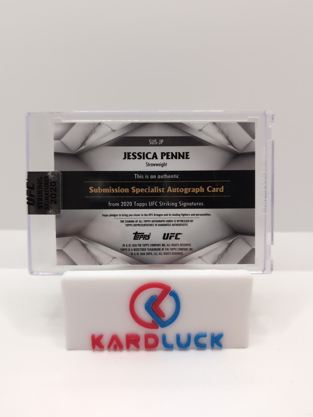 This 2020 Topps #SUS-JP Jessica Penne Auto Red #'d /8 trading card is a must-have for any UFC fan. Featuring the beloved MMA fighter, this card is perfect for collectors and enthusiasts alike. The card is part of the Topps set and has a parallel variety of red auto /8. The card is not only a great addition to any collection, but it also has a unique attribute of being an autographed card. This card was manufactured in 2020 and is not a vintage item. The card number is SUS-JP and it belongs to the category of Sports Mem, Cards & Fan Shop and Sports Trading Cards. Add this card to your collection today! Listed With Mascot.