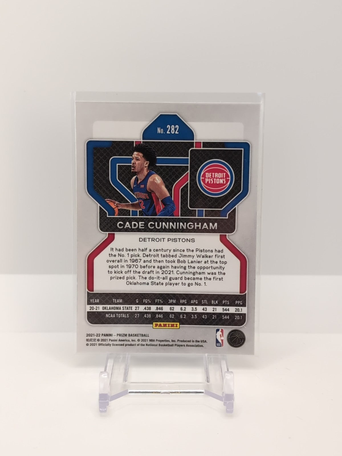 The product is a 2021-22 Panini Prizm #282 Cade Cunningham Pistons RC Rookie Card. This basketball trading card features the talented rookie player Cade Cunningham from the Detroit Pistons. Manufactured by Panini, this card is part of the highly sought-after Prizm set, known for its premium quality and exclusive design. As a rookie card from the 2021-22 season, it holds great value and appeal among collectors and fans of basketball trading cards. Listed With Mascot.
