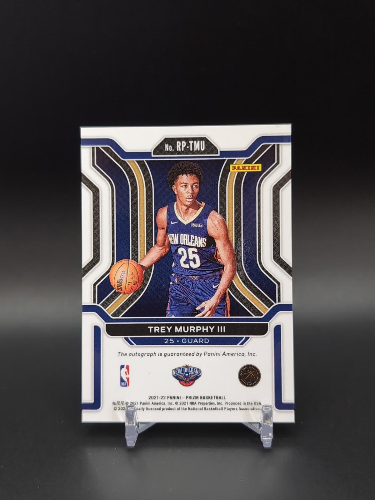 The product is a 2021-22 Panini Prizm Rookie Penmanship Trey Murphy III autographed trading card featuring the NBA player Trey Murphy III from the New Orleans Pelicans. This single-insert card is part of the 2021-22 Panini Prizm set and is a rookie card, making it a valuable addition to any basketball card collection for fans and collectors alike. The card is an original autograph from Trey Murphy III, adding to its uniqueness and appeal to fans of the NBA and basketball trading cards. Listed With Mascot.