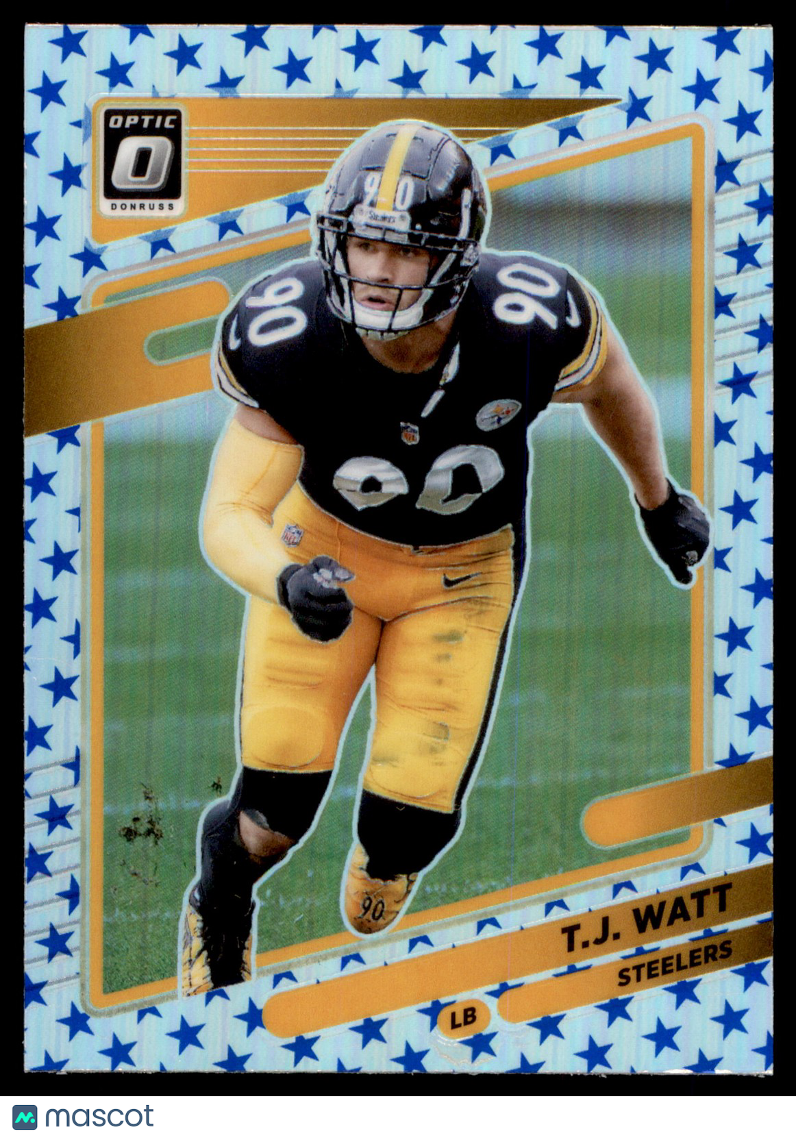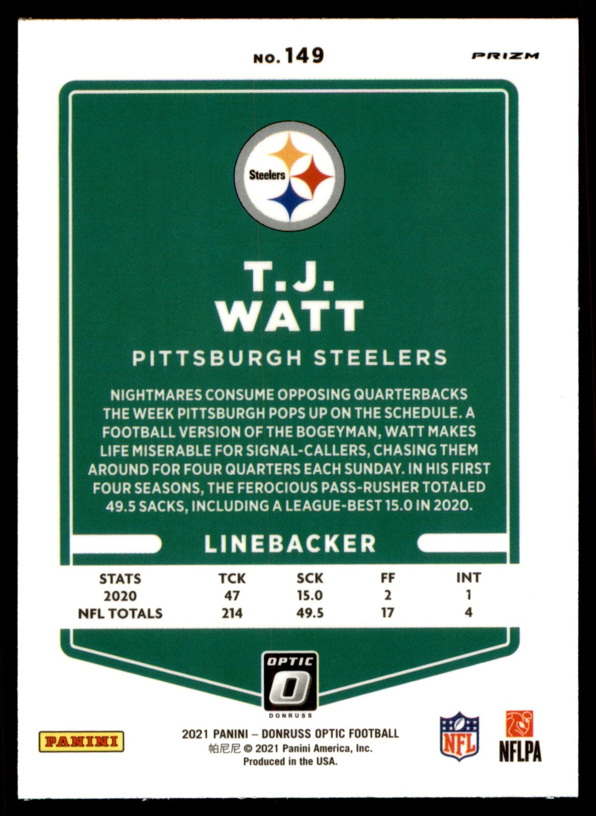 Item Description 2021 Donruss Optic T.J. Watt #149 Fire Pittsburgh Steelers Any visible lines on the images are due to the hi-res scanner and are not on the actual card. Refer to hi-res images to evaluate card condition Shipping Please refer to the listing specifics for shipping price. Return Policy No Returns for Trading Cards Consignment Options Looking to sell your cards, but don't have time? Reach out to use here on eBay and we will be happy to assist you! Listed With Mascot.
