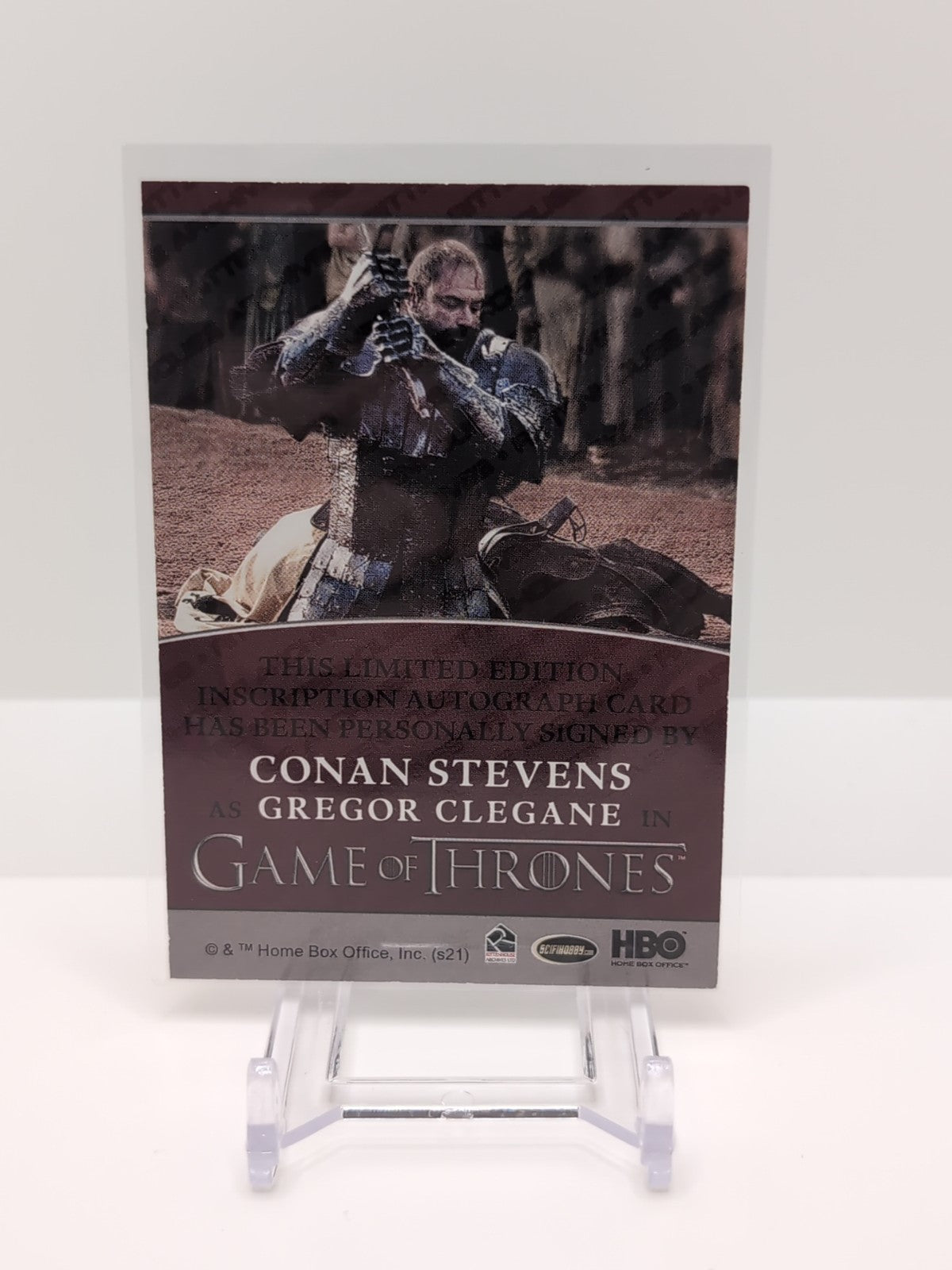 The 2021 Game of Thrones The Iron Anniversary Series 1 Conan Stevens Auto trading card is a rare and highly sought-after collectible for fans of the popular TV show. This single-insert card features an autograph from Conan Stevens, who portrayed the character Gregor Clegane in Season 1. Manufactured by Rittenhouse, this original non-sport trading card is a valuable addition to any Game of Thrones memorabilia collection, capturing a significant moment in the series' history. Listed With Mascot.