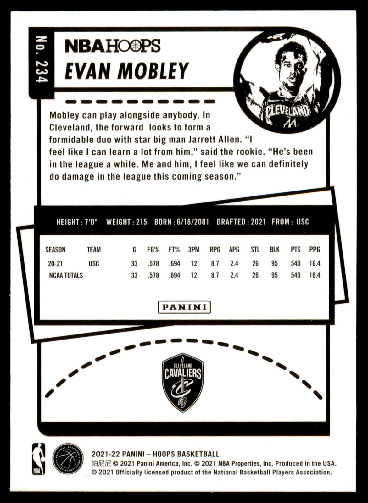 Item Description 2021 Hoops Evan Mobley #234 Blue Cleveland Cavaliers Any visible lines on the images are due to the hi-res scanner and are not on the actual card. Refer to hi-res images to evaluate card condition Shipping Please refer to the listing specifics for shipping price. Return Policy No Returns for Trading Cards Consignment Options Looking to sell your cards, but don't have time? Reach out to use here on eBay and we will be happy to assist you! Listed With Mascot.