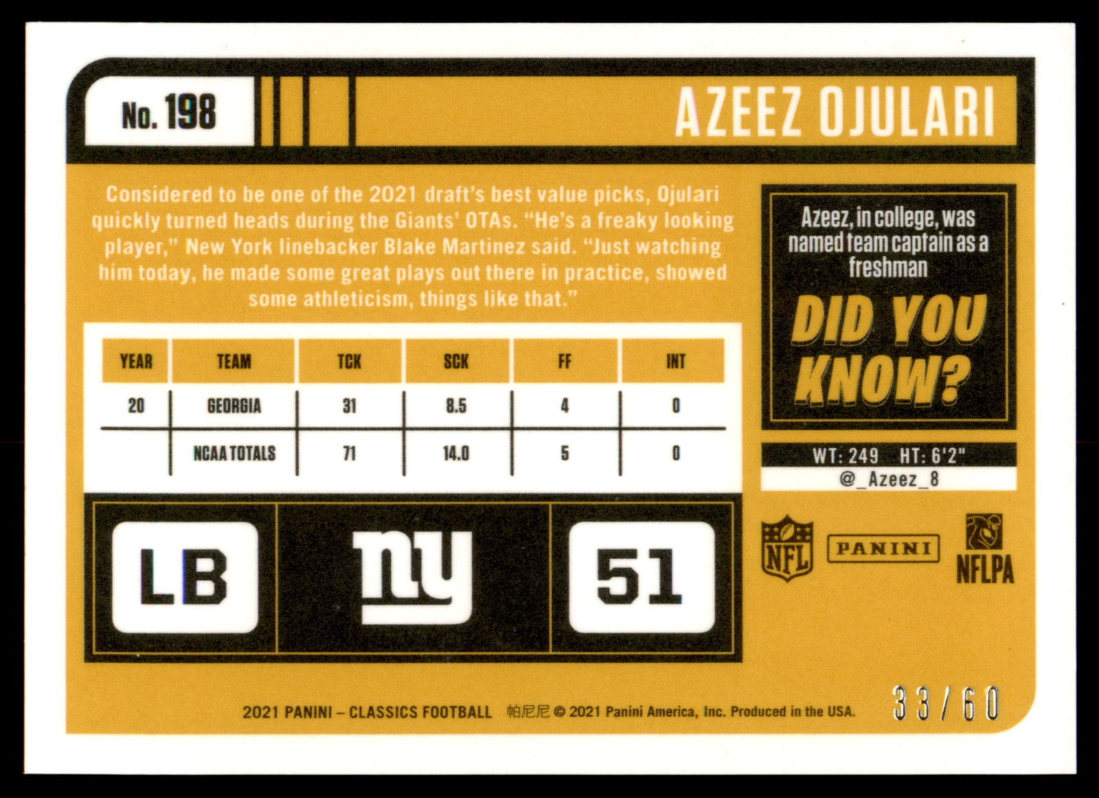 2021 Panini Classics Azeez Ojulari #198 Premium Edition Timeless Tributes Gold /