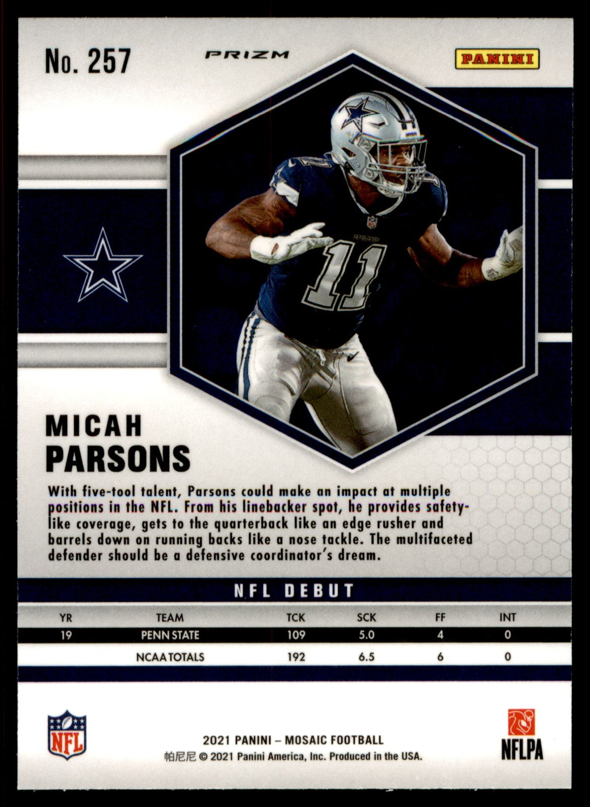 Item Description 2021 Panini Mosaic Micah Parsons #257 Prizm Camo Pink Dallas Cowboys Any visible lines on the images are due to the hi-res scanner and are not on the actual card. Refer to hi-res images to evaluate card condition Shipping Please refer to the listing specifics for shipping price. Return Policy No Returns for Trading Cards Consignment Options Looking to sell your cards, but don't have time? Reach out to use here on eBay and we will be happy to assist you! Listed With Mascot.