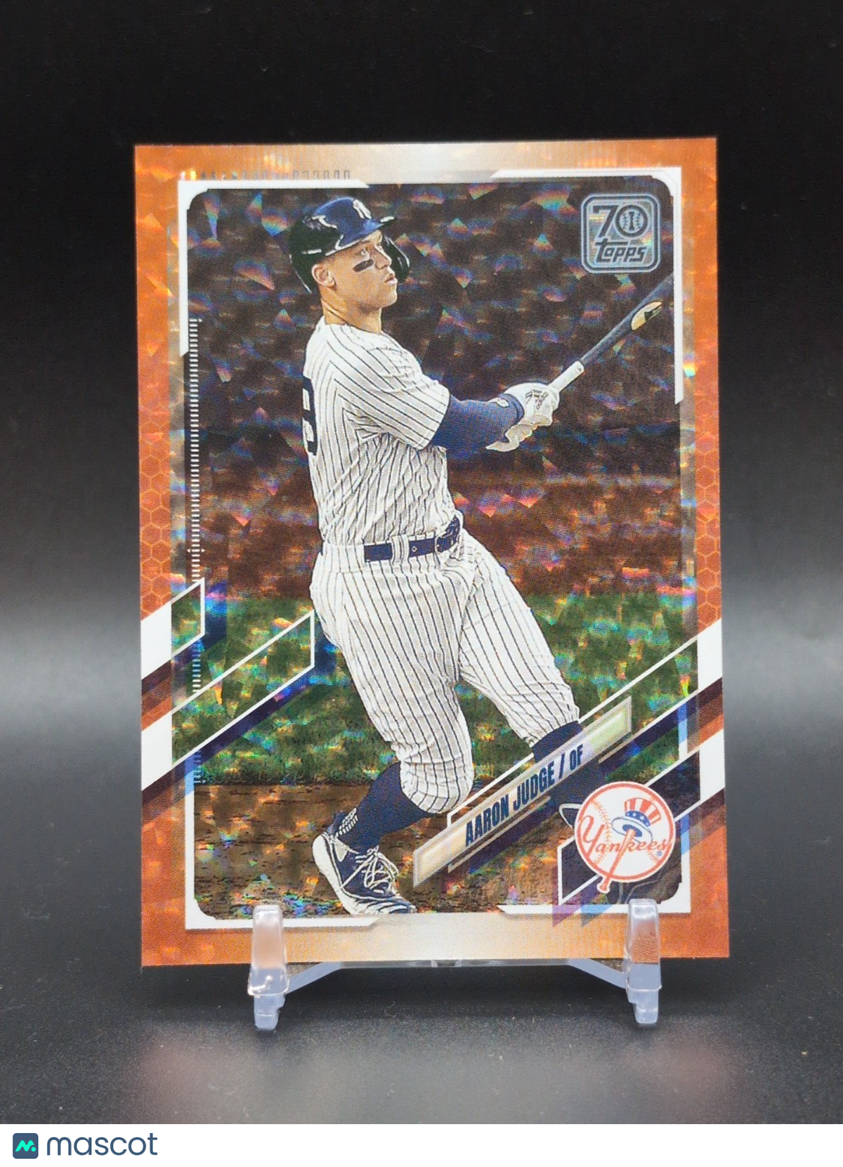 The product is a 2021 Topps Series 1 Aaron Judge Orange Foil trading card numbered /299, featuring the player from the New York Yankees. This baseball collectible is part of the 2021 Topps Rainbow Foil insert set, with a standard card size and not autographed. Manufactured by Topps, this original sports trading card is a parallel/variety that is sure to be sought after by fans and collectors alike. Listed With Mascot.