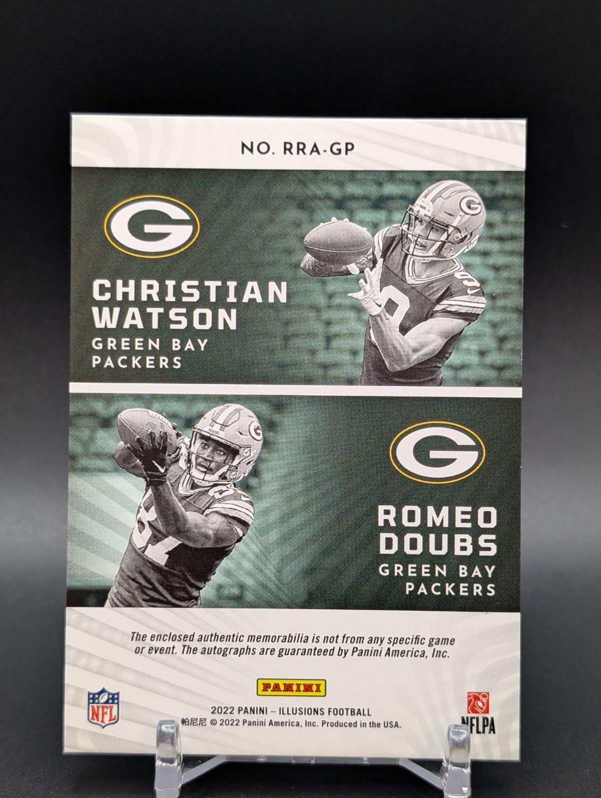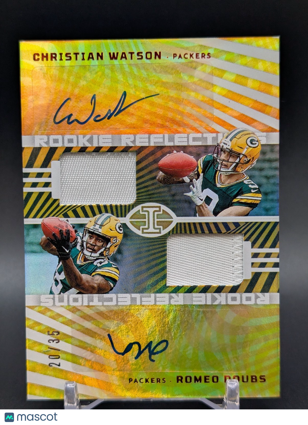 The product is a 2022 Illusions Christian Watson Romeo Doubs Rookie Reflections Patch Auto trading card, part of the 2022 Panini Illusions set. This card features a patch design with the autographs of rookie players Christian Watson and Romeo Doubs, both from the Green Bay Packers. With a limited edition of only 35 cards produced, this collectible item is a prized possession for fans and collectors of football trading cards. Listed With Mascot.