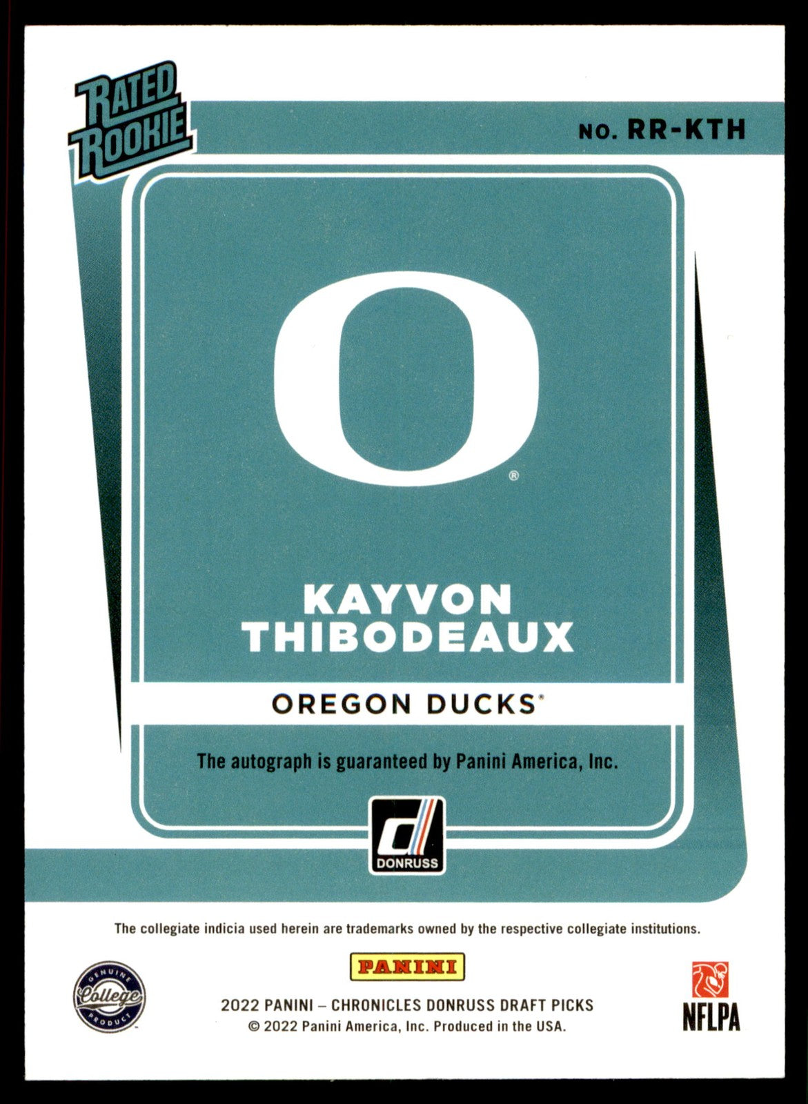 Item Description 2022 Panini Chronicles Draft Picks Kayvon Thibodeaux #RR-KTH Donruss Rated Rookie Autographs Donruss Rated Rookie Autographs Purple /15 Oregon Ducks Any visible lines on the images are due to the hi-res scanner and are not on the actual card. Refer to hi-res images to evaluate card condition Shipping Please refer to the listing specifics for shipping price. Return Policy No Returns for Trading Cards Consignment Options Looking to sell your cards, but don't have time? Reach out to use here on eBay and we will be happy to assist you! Listed With Mascot.