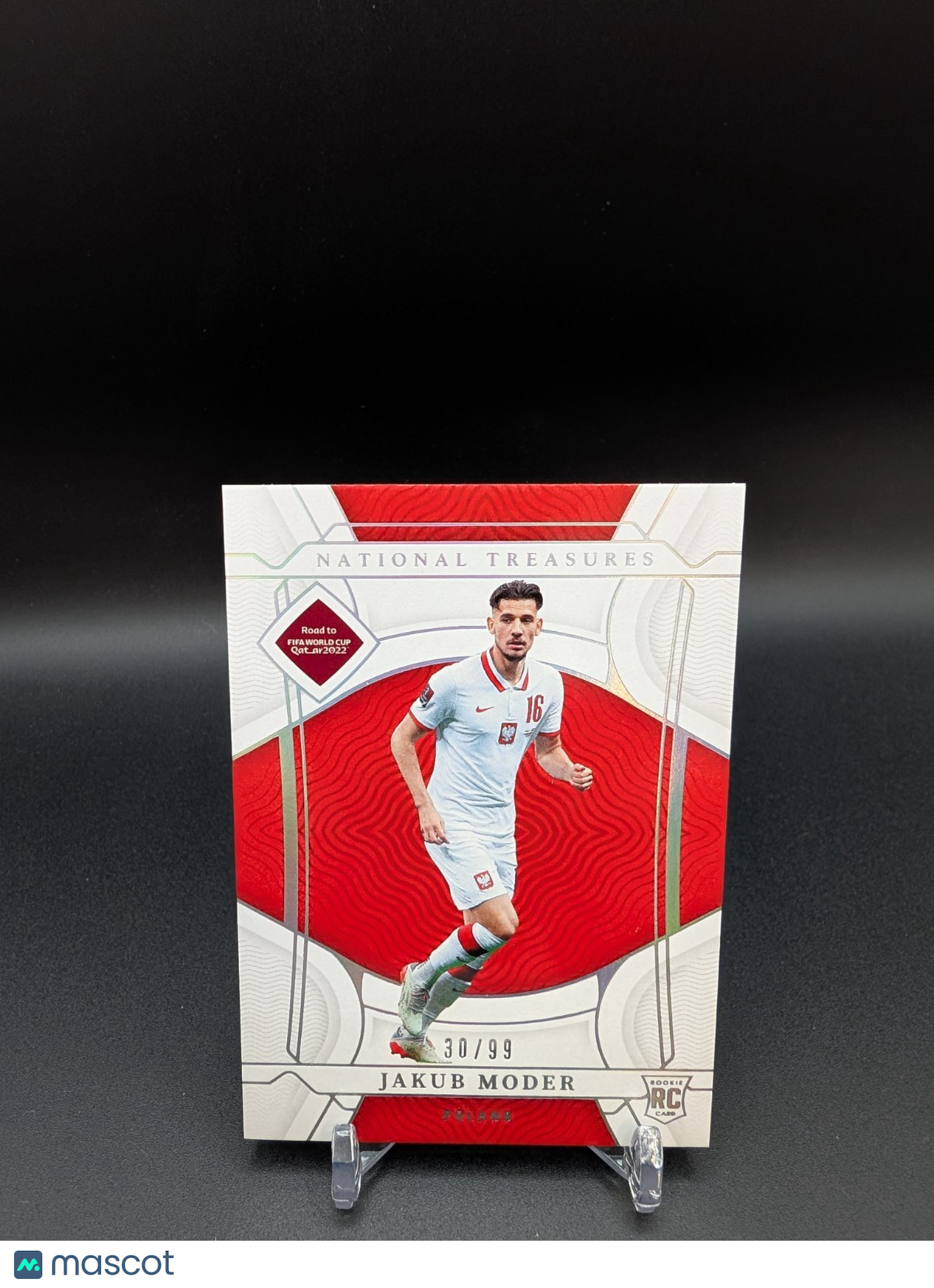 Capture a piece of soccer history with the 2022 Panini National Treasures Road to FIFA World Cup Jakub Moder card, number 102. This trading card features the talented Jakub Moder of Poland, capturing the spirit of the sport and the fervor of the upcoming World Cup. It is a must-have for collectors and fans alike, offering a tangible connection to the player and the team. The card is part of the highly sought-after 2022 Panini National Treasures Road to FIFA World Cup - [Base] set and is a single product offering. Manufactured by Panini America, Inc., it boasts serial numbered attributes, ensuring its uniqueness and collectible value. This original piece from the 2022 season is a genuine treasure for any soccer enthusiast or collector of sports memorabilia. Listed With Mascot.
