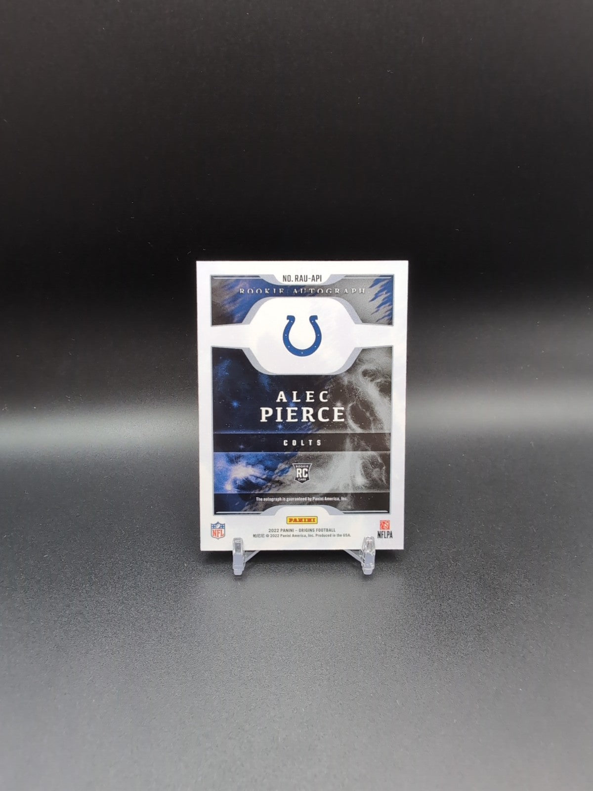 Elevate your football card collection with the 2022 Panini Origins Rookie Autographs #RAU-API featuring Alec Pierce. As a treasured addition from the Rookie Autographs insert set, this card showcases the promising talent of Alec Pierce, adorned with his authentic autograph. This original card is a must-have for enthusiasts and collectors following the Indianapolis Colts or Pierce's burgeoning career. Crafted by Panini, the acclaimed sports card manufacturer, this item captures the essence of the National Football League's 2022 season. With its pristine design and the prestige of the Origins series, this card holds a special appeal for those who appreciate the athleticism and potential of up-and-coming NFL players. Listed With Mascot.