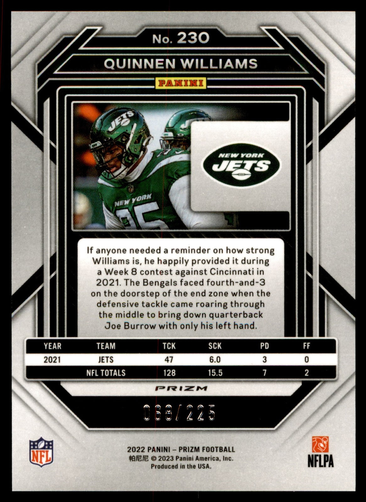 2022 Panini Prizm Quinnen Williams #230 Purple Ice Prizms /225