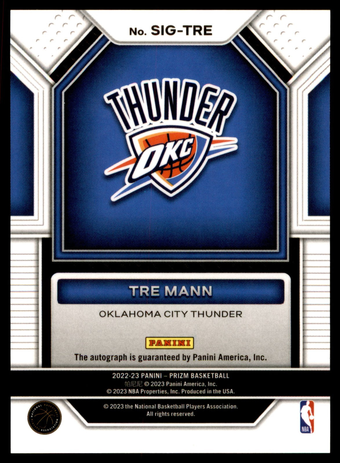 Item Description 2022 Panini Prizm Tre Mann #44 Signatures Oklahoma City Thunder Any visible lines on the images are due to the hi-res scanner and are not on the actual card. Refer to hi-res images to evaluate card condition Shipping Please refer to the listing specifics for shipping price. Return Policy No Returns for Trading Cards Consignment Options Looking to sell your cards, but don't have time? Reach out to use here on eBay and we will be happy to assist you! Listed With Mascot.