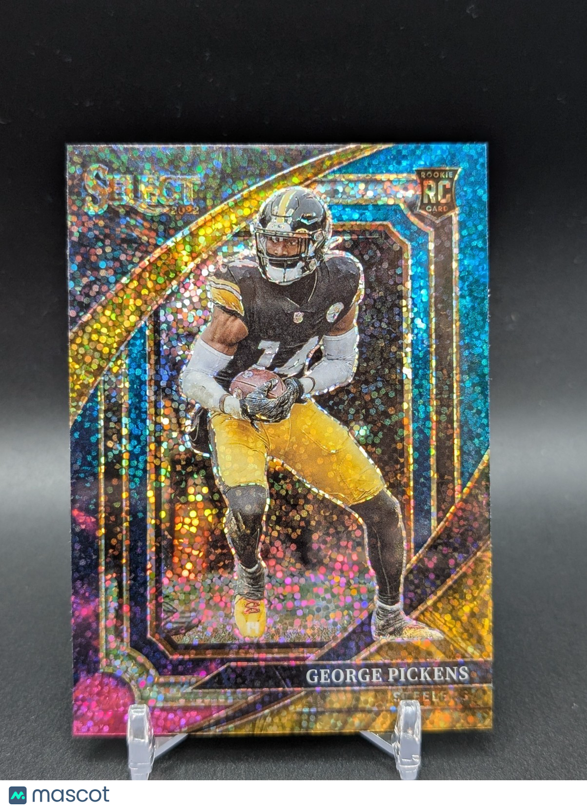 Elevate your collection with the 2022 Panini Select Football George Pickens Suite Level Cosmic Prizm #343. This card captures the essence of the Pittsburgh Steelers' tight end with its stunning Cosmic parallel that's sure to catch the eye of any collector or football enthusiast. As a rookie card, it holds the potential for future value, making it a worthy addition to your assortment of sports memorabilia. From the highly sought-after 2022 Panini Select Football set, this card showcases the exceptional quality that Panini is known for. Celebrate the energy of the National Football League (NFL) and the promise of George Pickens with this unique piece of sports history. Whether you're a dedicated fan of the Steelers or a connoisseur of rare trading cards, this item holds its own special allure. Listed With Mascot.
